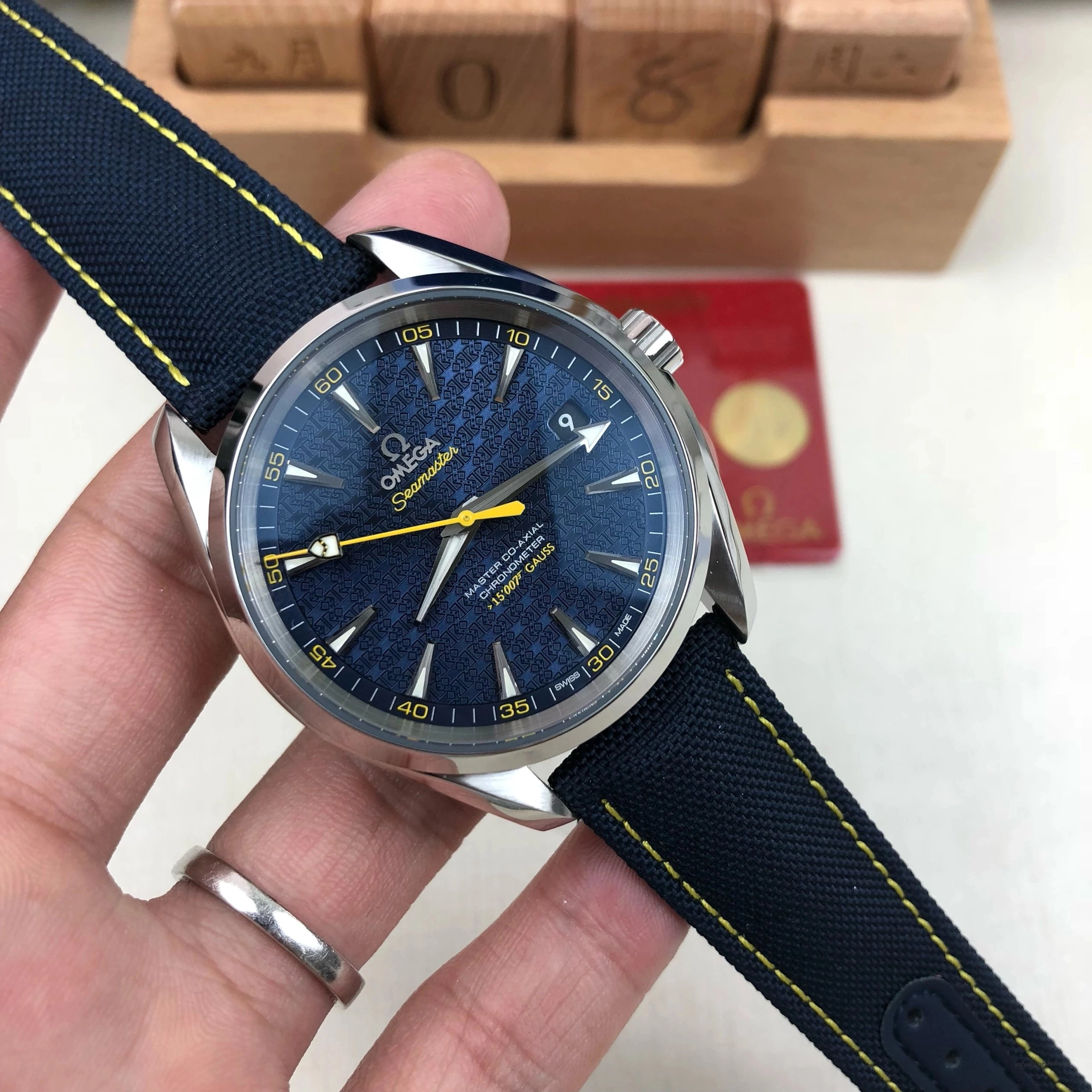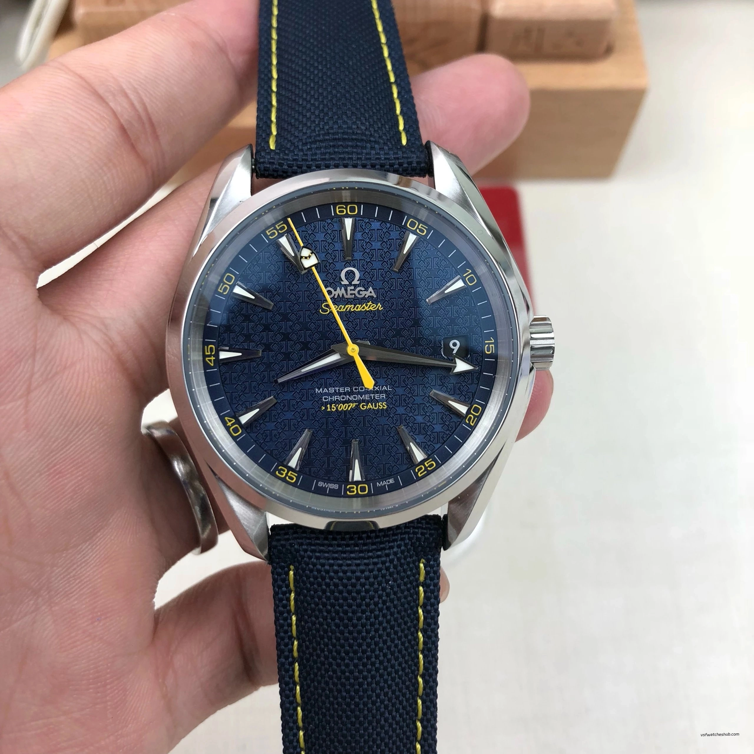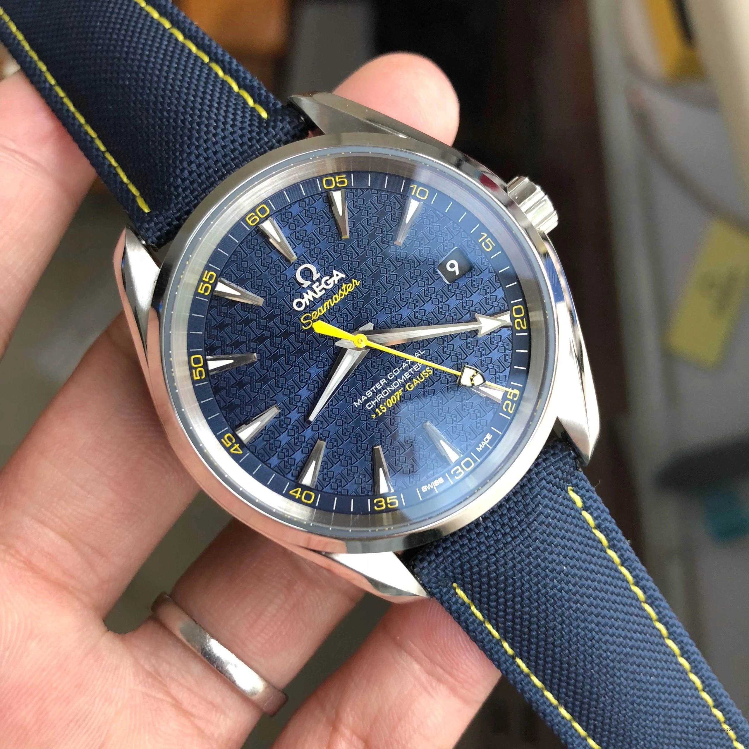 Dial: Blue James Bond “Bullet Pattern” Dial with Yellow Seconds Hand