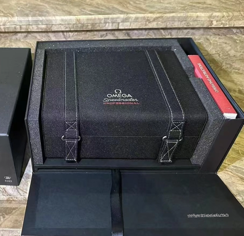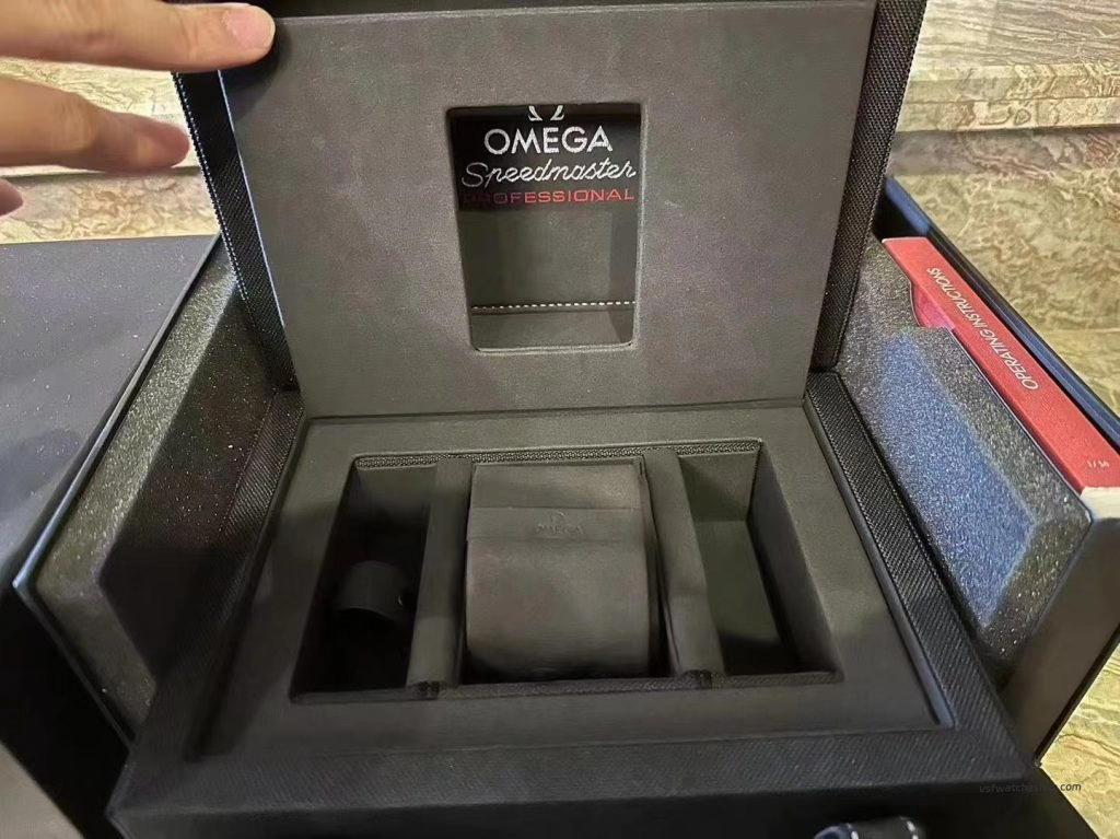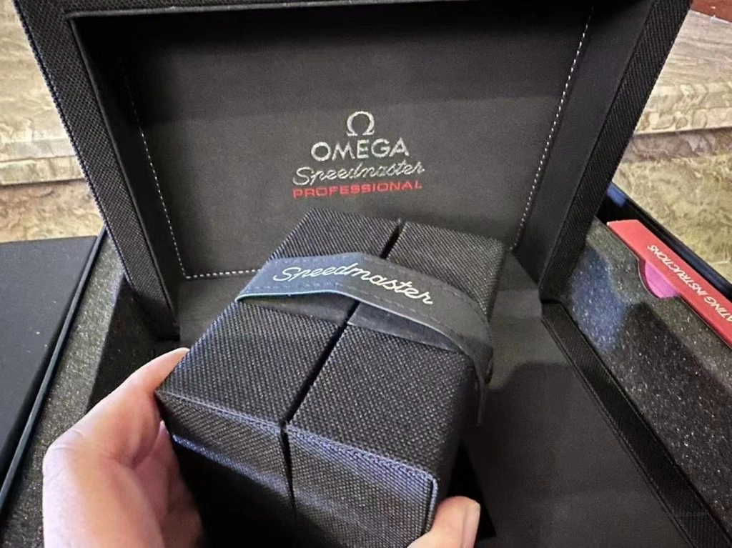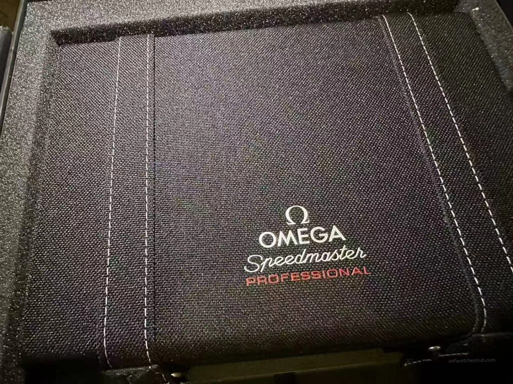 This Omega Speedmaster Professional Moonwatch original style presentation box features a durable black fabric travel case design with full set packaging structure. Specially designed for Omega Speedmaster Professional Moonwatch models and suitable for storage, display or replacement packaging use.
