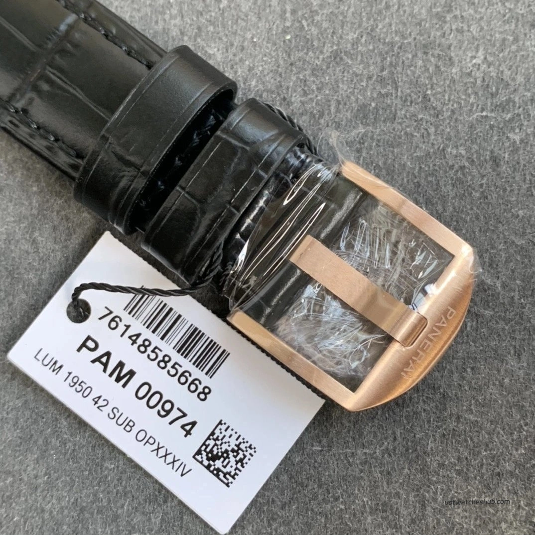 Case material is where things get interesting. Gen uses precious metal. VS went with steel and rose gold plating. Gotta say though — the plating is seriously well done. Super bright finish, the polished sides catch light real nice. Crown guards, bezel edges, strap stitching — all clean work from VS on this PAM00974 rep.