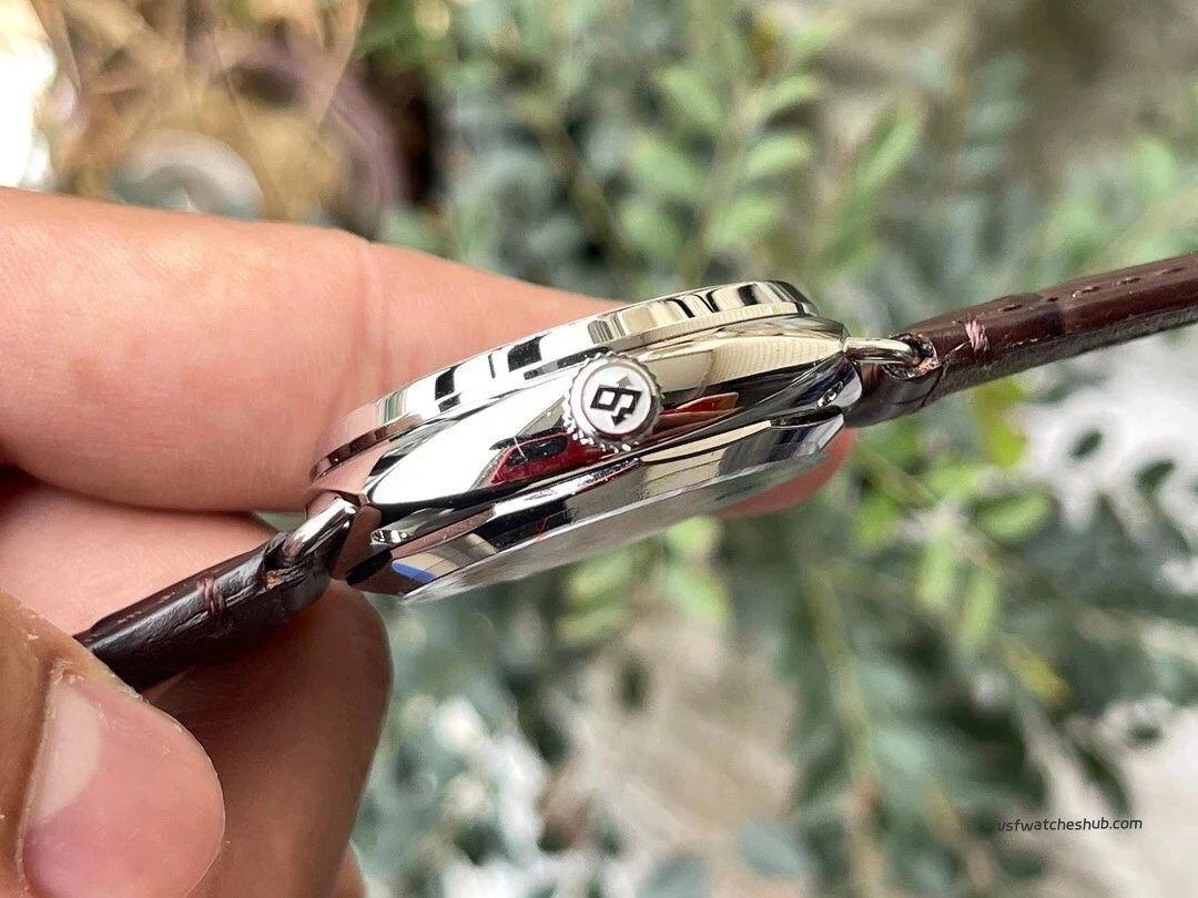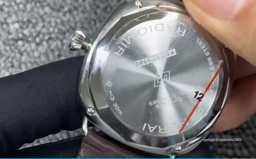 So VS dropped the crown guard on this one, which is correct for the Radiomir design. Unscrew by turning counter-clockwise. Wind it by turning clockwise — straightforward manual winding.