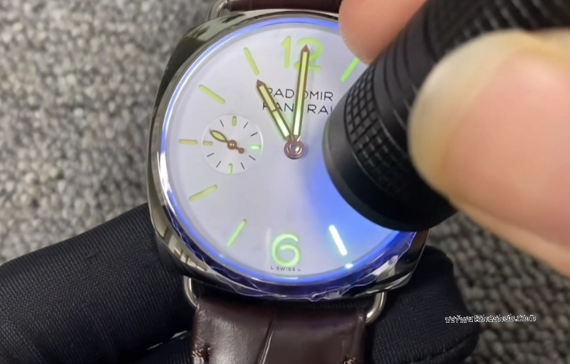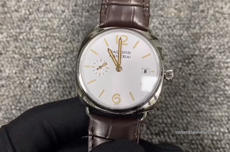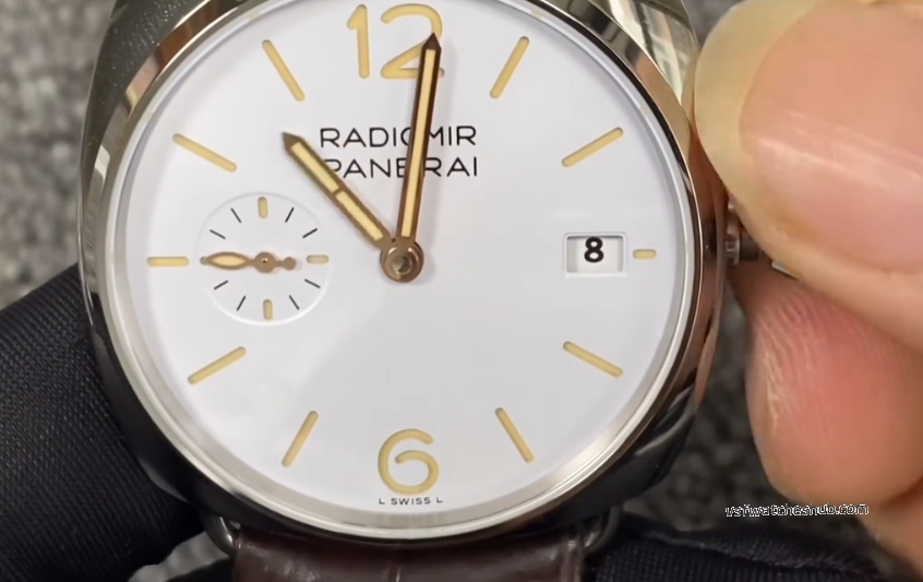 Cream white colorway with the sandwich dial construction. That's the double-layer structure where the lume shines through cutouts on the top layer — signature Radiomir stuff and honestly one of the best-looking dial designs in the watch world, gen or rep.