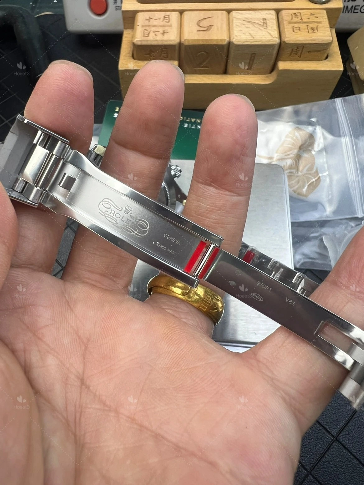 Inside the lugs you'll find the precious metal hallmarks — Pt950 stamp, the dog head mark, 750 designation. All present and accounted for. Little details but they add up fast, especially if anyone ever takes a closer look at your wrist.