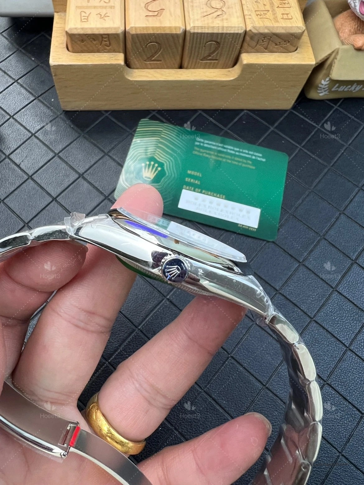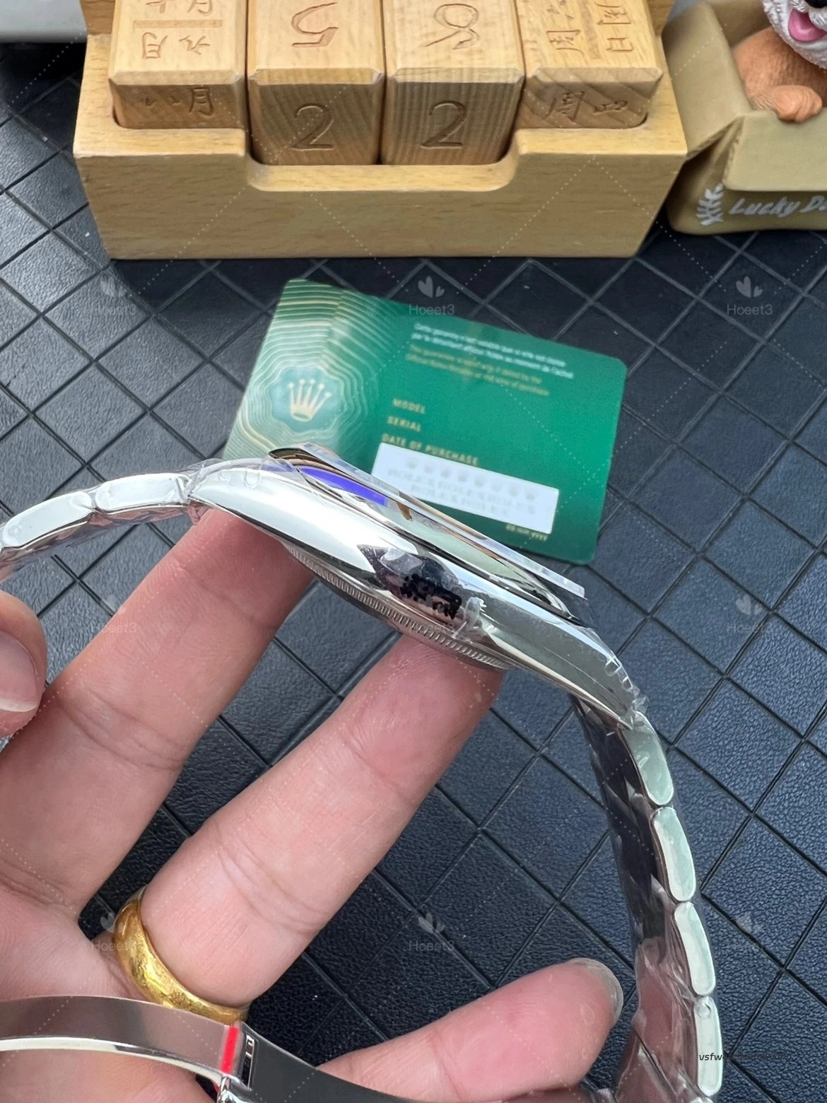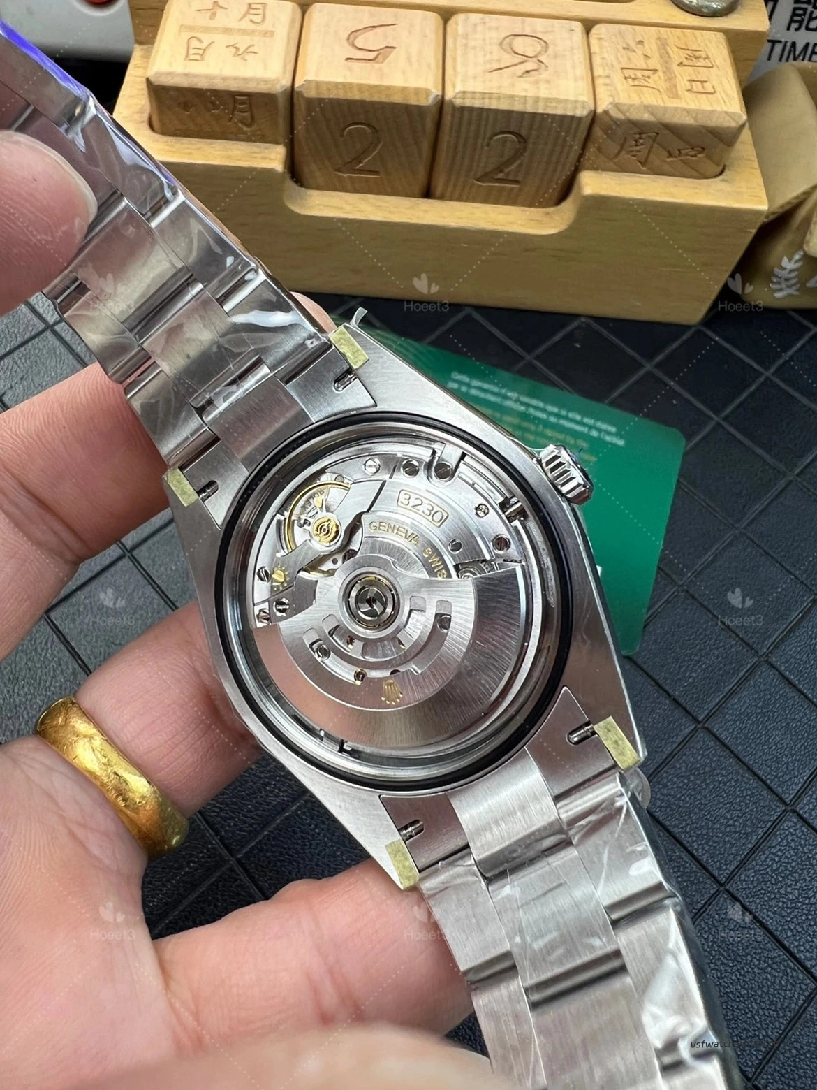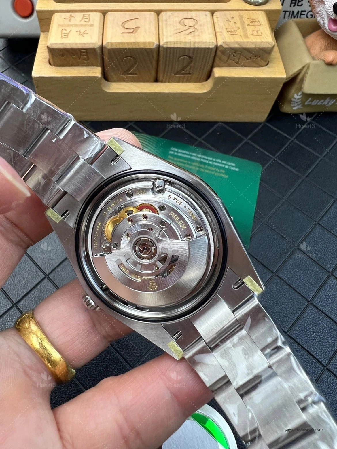 From a detail perspective, this VS Factory 124300 shows the features that many buyers specifically pay attention to. The watch includes the small crown at 6 o’clock, which is an important detail on newer versions. The center pinion, hour markers, and overall dial finishing also look clean and well presented.