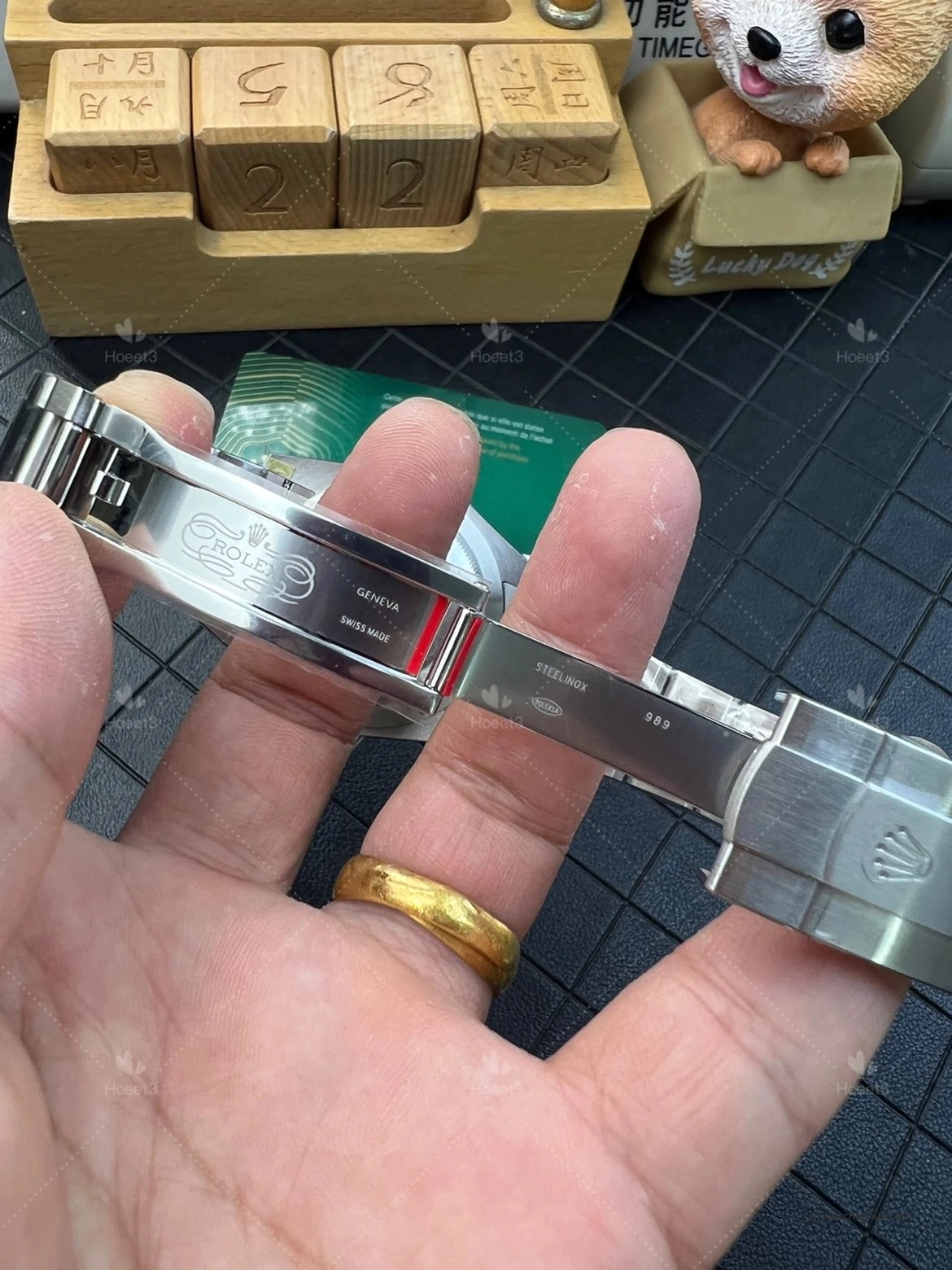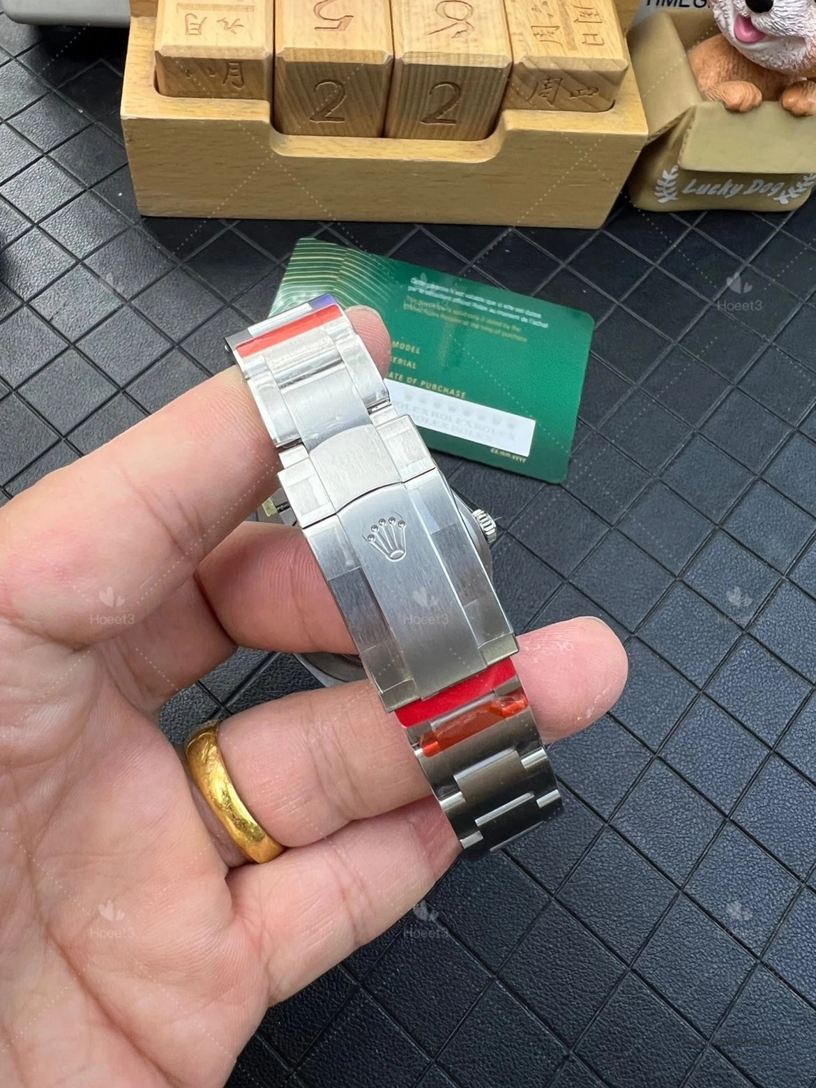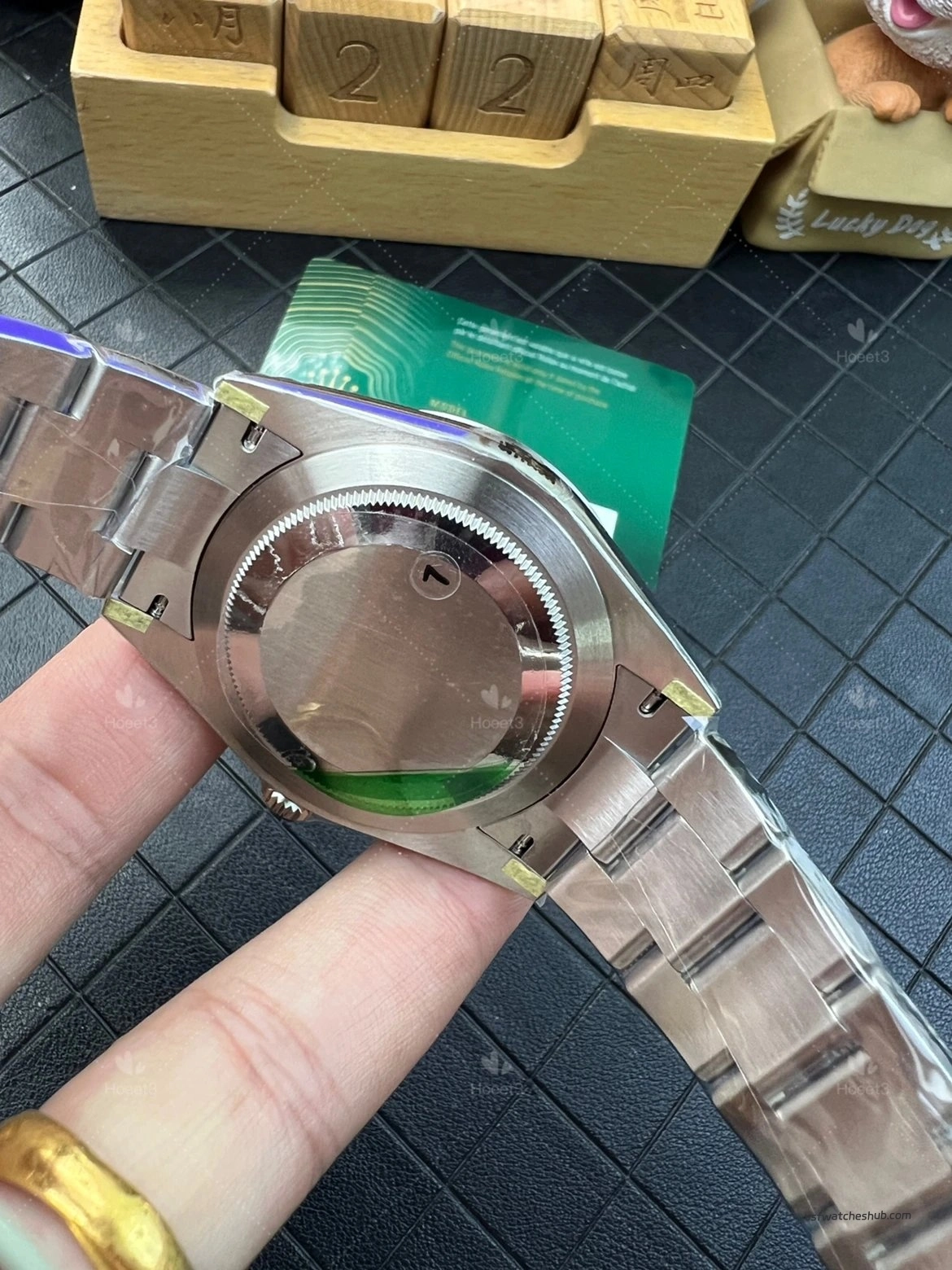 The clasp interior also appears clean. As with many new pieces, there may still be protective film inside the clasp, so it is normal to see a slight color tint from the film before it is removed. Small details like this help preserve the watch in fresh condition and add to the overall presentation.