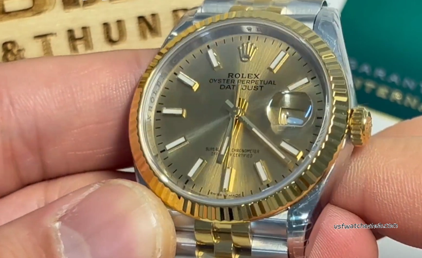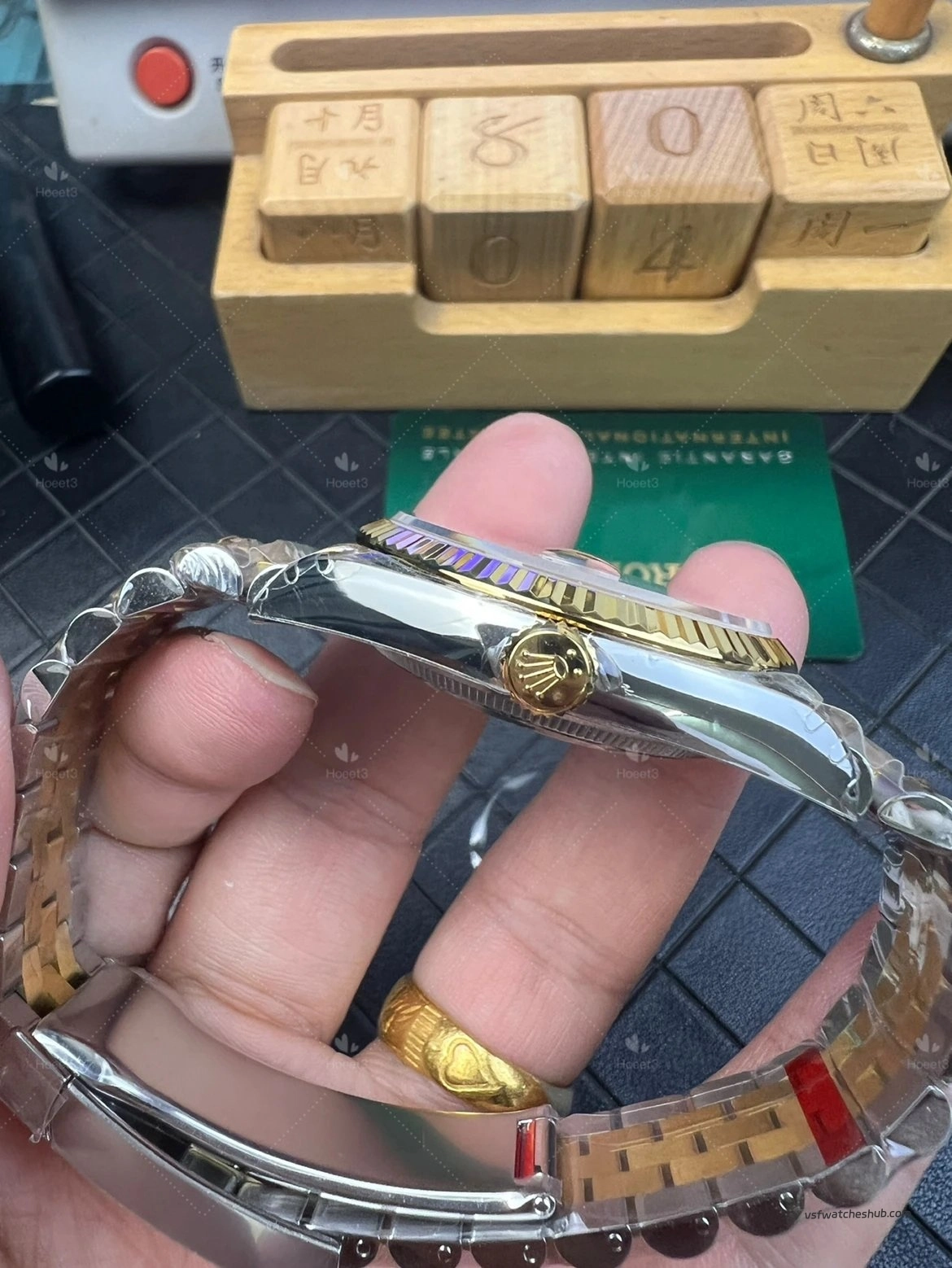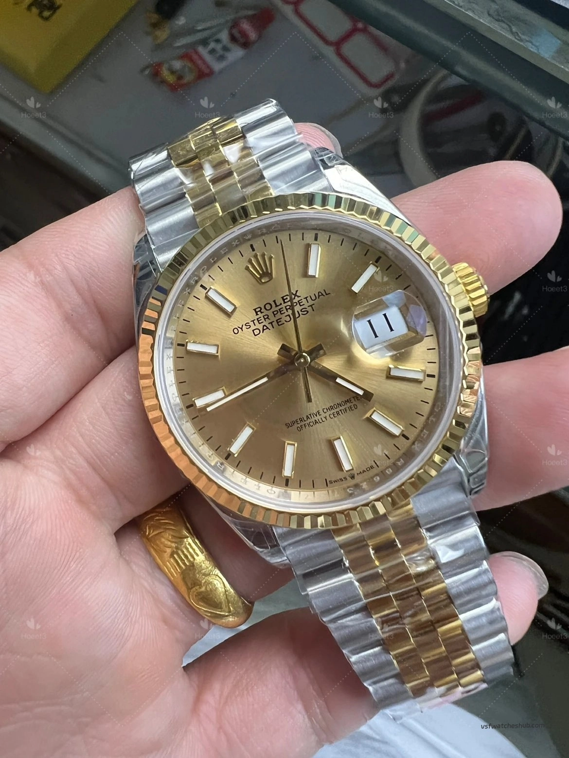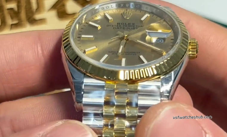 On a two-tone Datejust, the bezel is one of the most important visual elements, and VS Factory did a solid job here. The gold tone looks even, the shine is clean without appearing overly artificial, and the cutting of the fluted edges gives the watch the crisp sparkle you want from a Datejust.