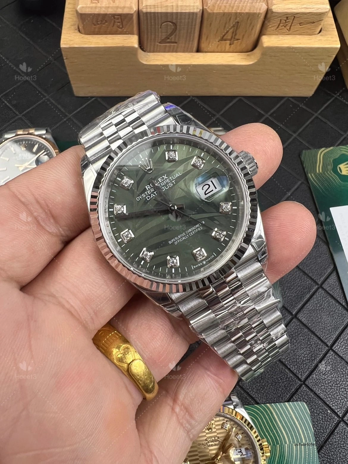 •Palm motif dial texture and diamond marker layout replicate GEN visual depth.
