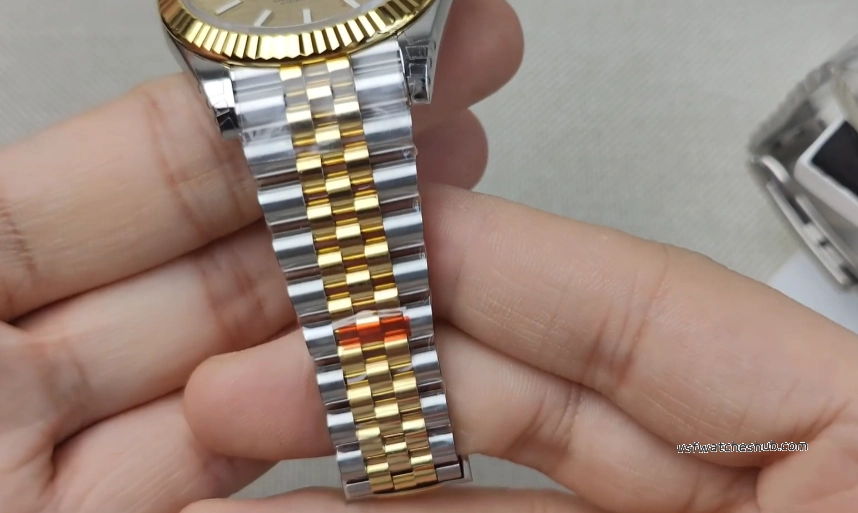 This watch uses a steel bracelet with gold-tone center links, and this is one area where stronger factories usually separate themselves from lower-grade versions.