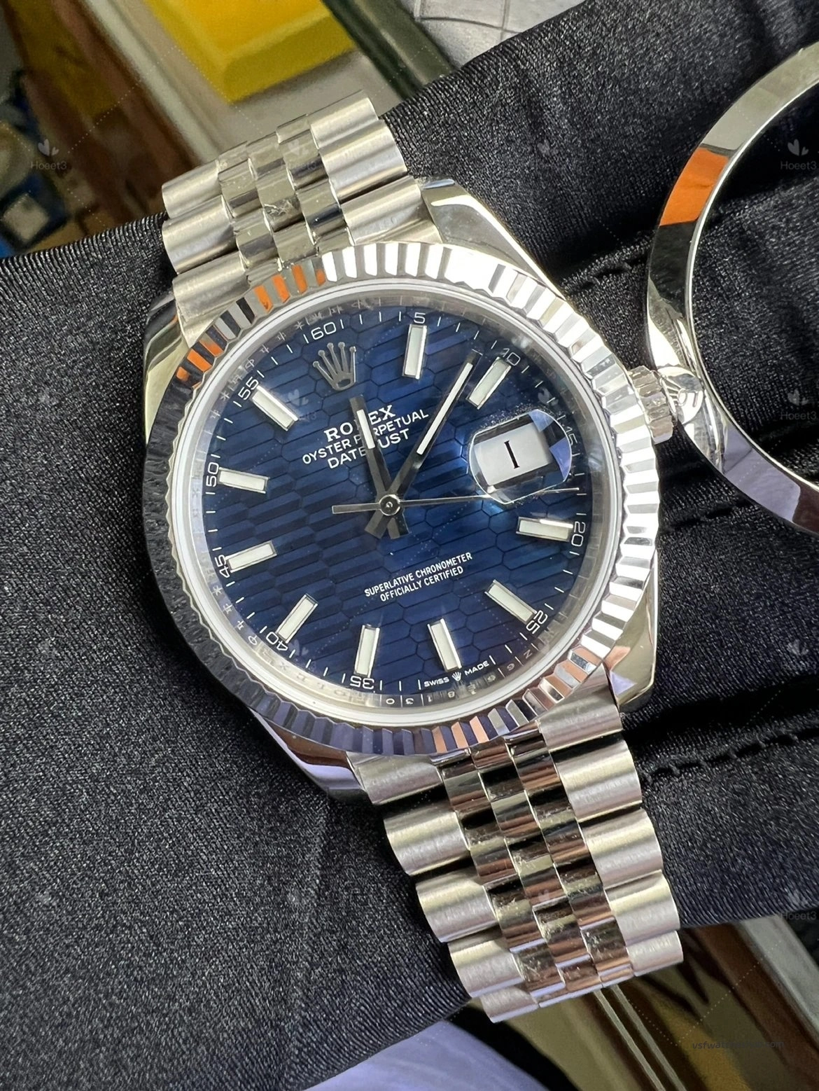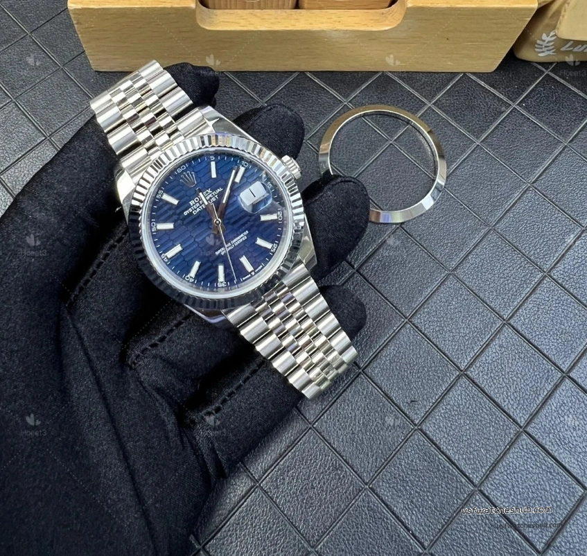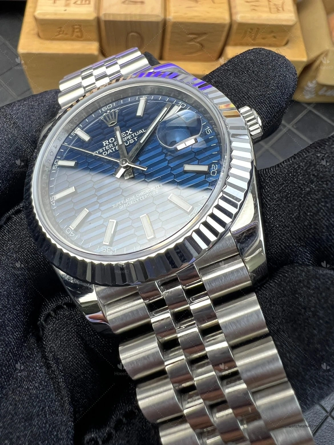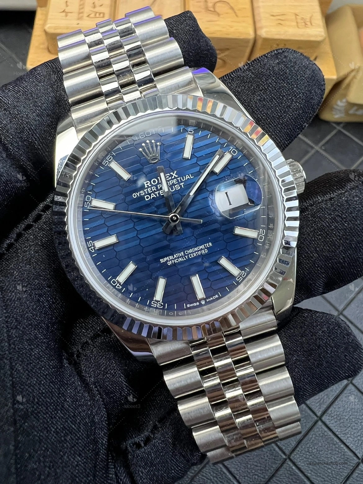 The blue version looks slightly darker in hand than it may appear under intense light, while the green tone has a fresh mint-like feel. The blue color itself is close to the standard blue Datejust dial, but the added wave texture makes it look more layered and more refined on the wrist. If you like Datejust models with a little more personality, this is definitely one of the more attractive recent releases.