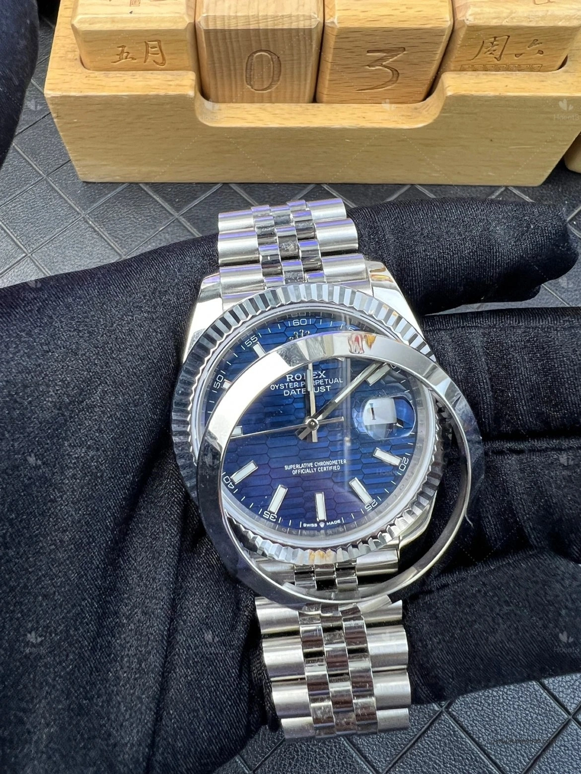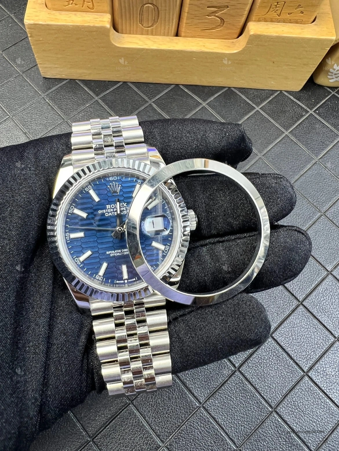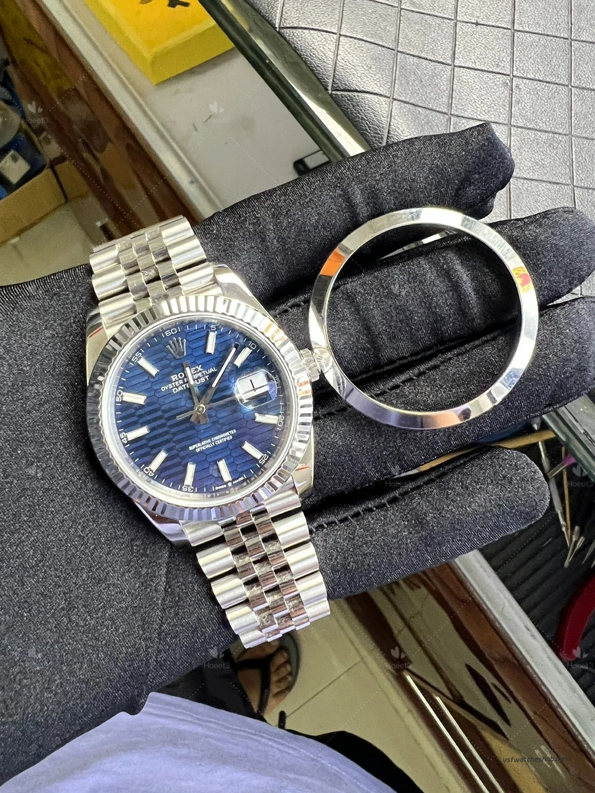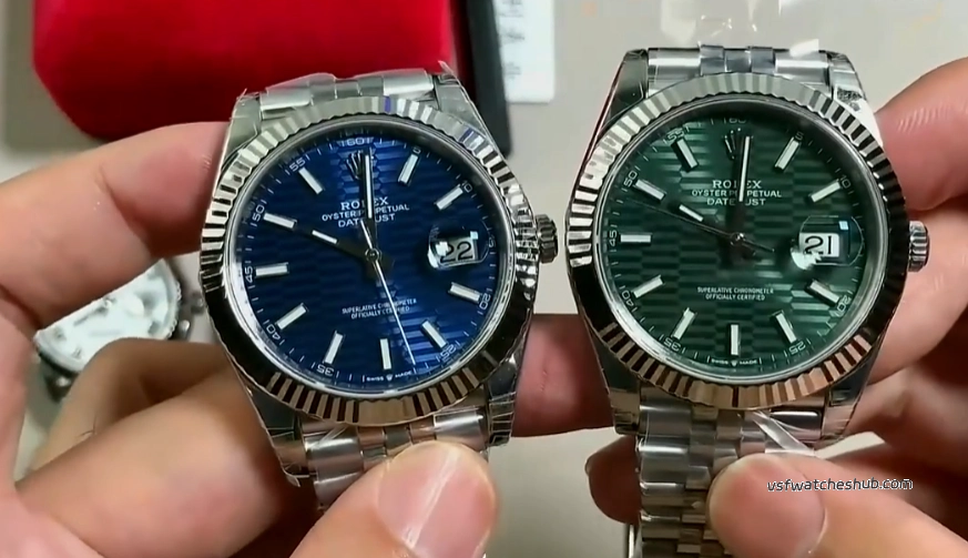 The blue version looks slightly darker in hand than it may appear under intense light, while the green tone has a fresh mint-like feel. The blue color itself is close to the standard blue Datejust dial, but the added wave texture makes it look more layered and more refined on the wrist. If you like Datejust models with a little more personality, this is definitely one of the more attractive recent releases.