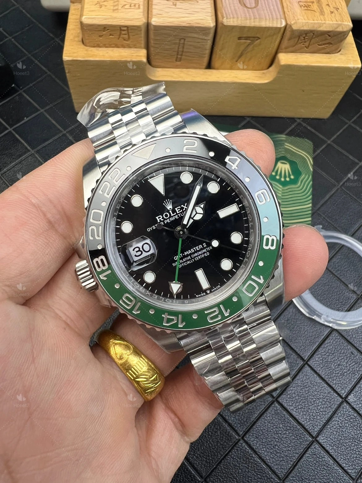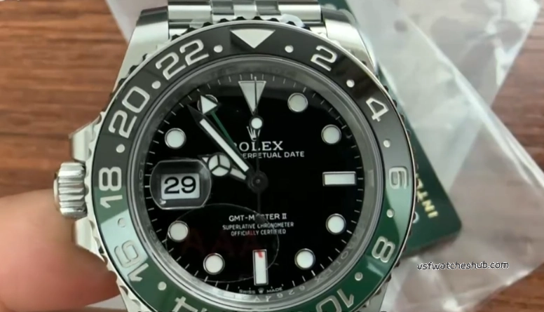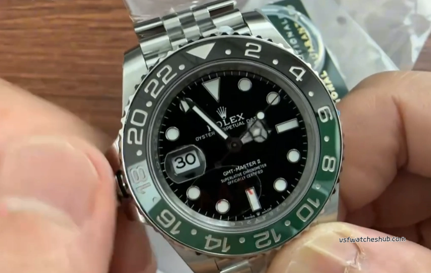 First thing you notice on the VS Factory Rolex GMT-Master II 126720VTNR is the bezel. They're using the same ceramic insert sourced from the same supplier as Clean factory. Color-wise it's very close to gen. The transition from black to green around the 6 to 18 markers is smooth — no hard line, no obvious split.
