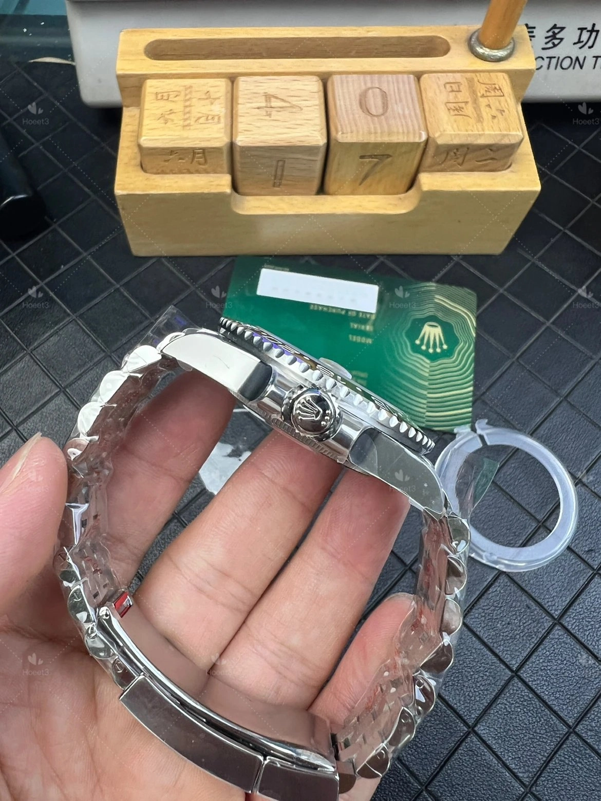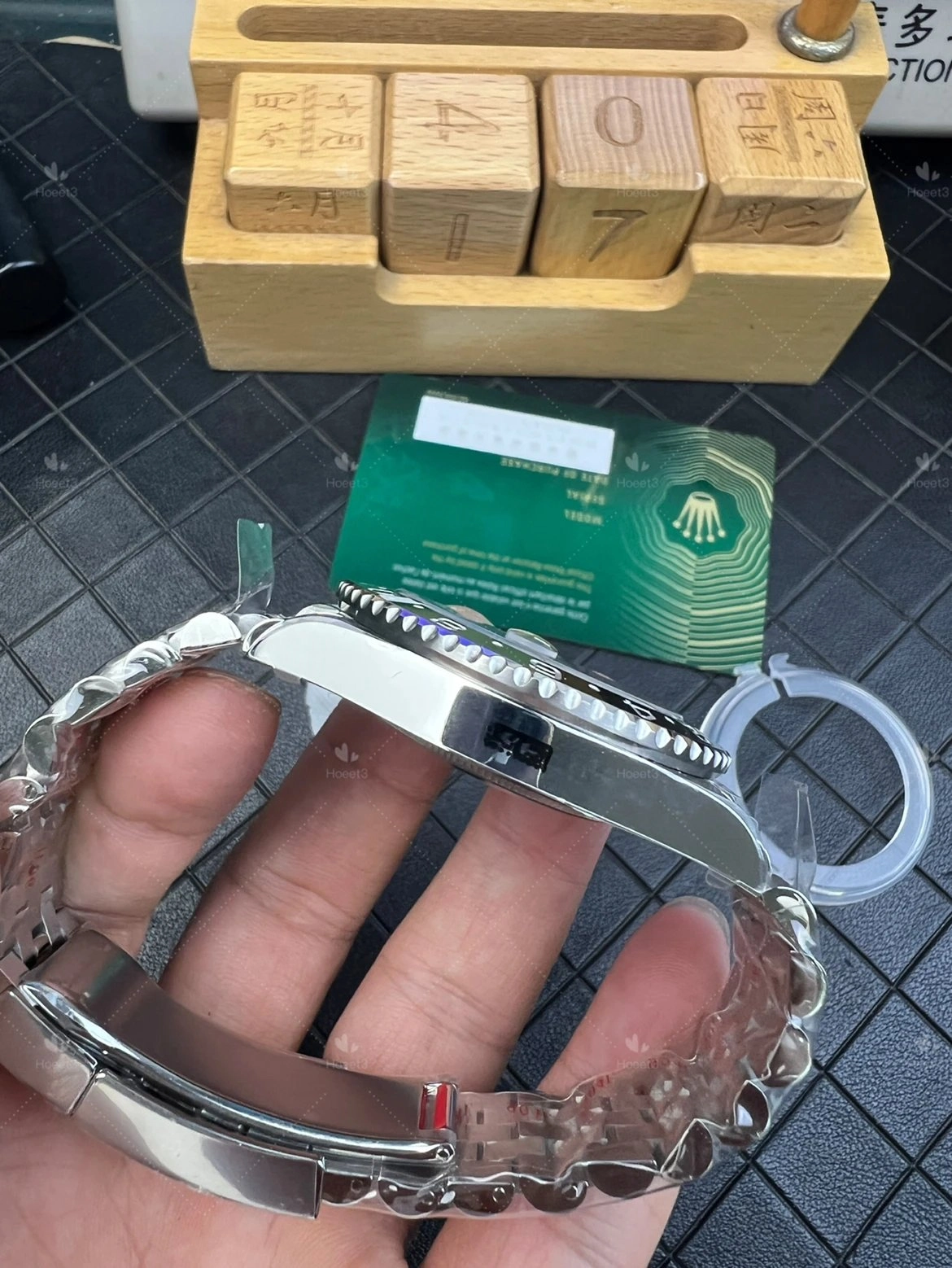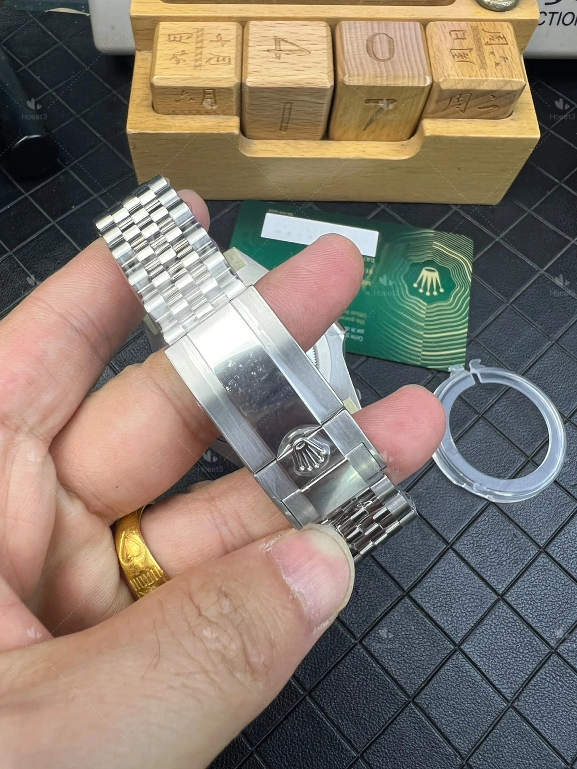 Bracelet ships as a five-link Jubilee for now. Word is a three-link Oyster option is coming later.