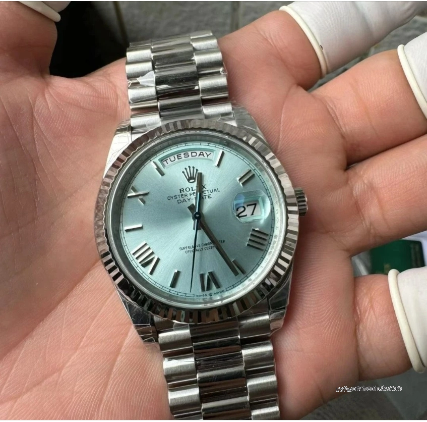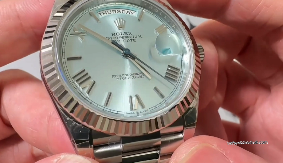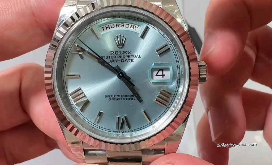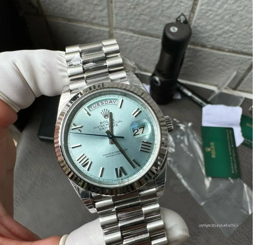 The Ice Blue dial is exclusive to platinum Day-Date models in the genuine Rolex lineup, making it one of the most recognizable premium configurations.