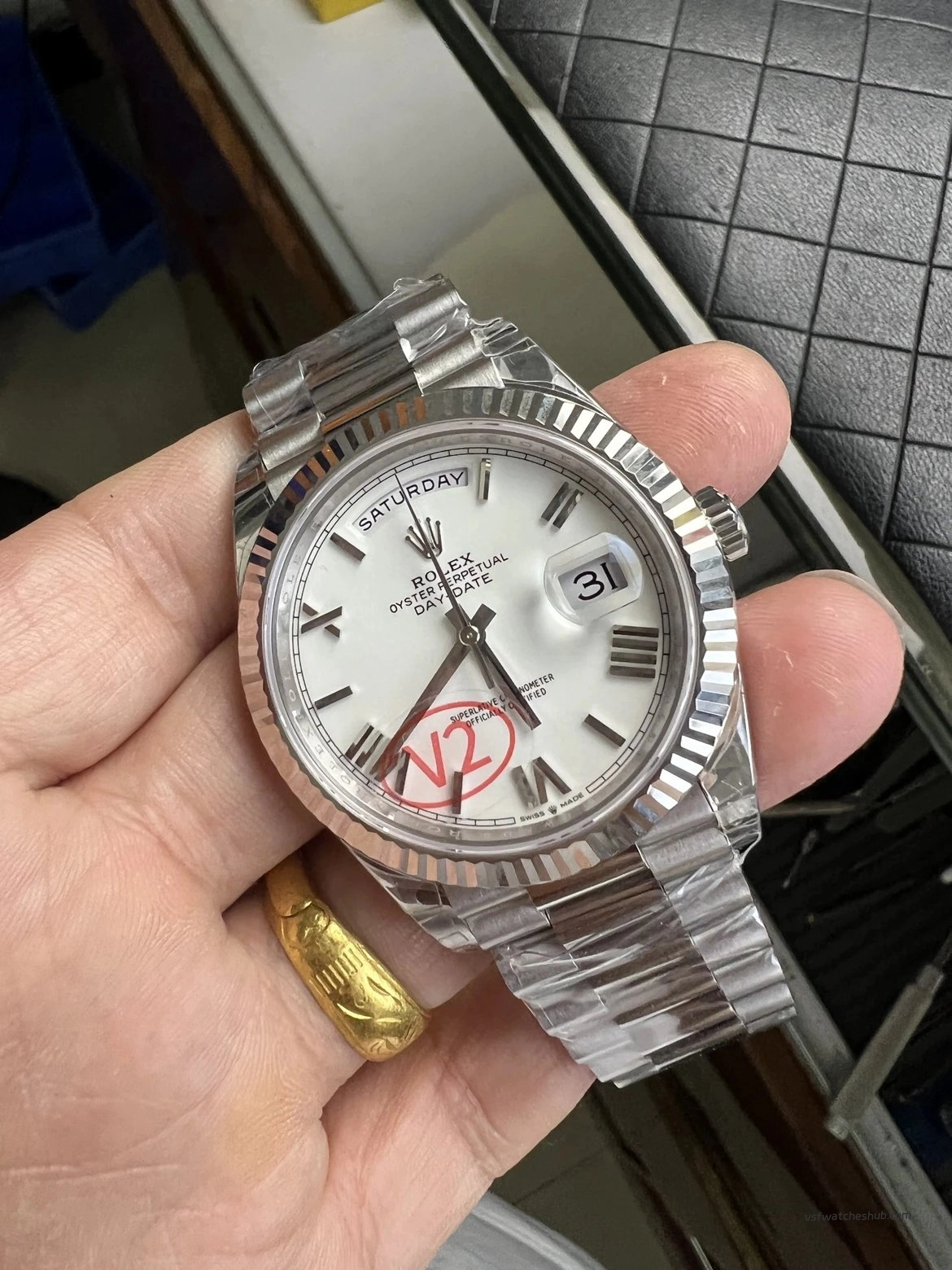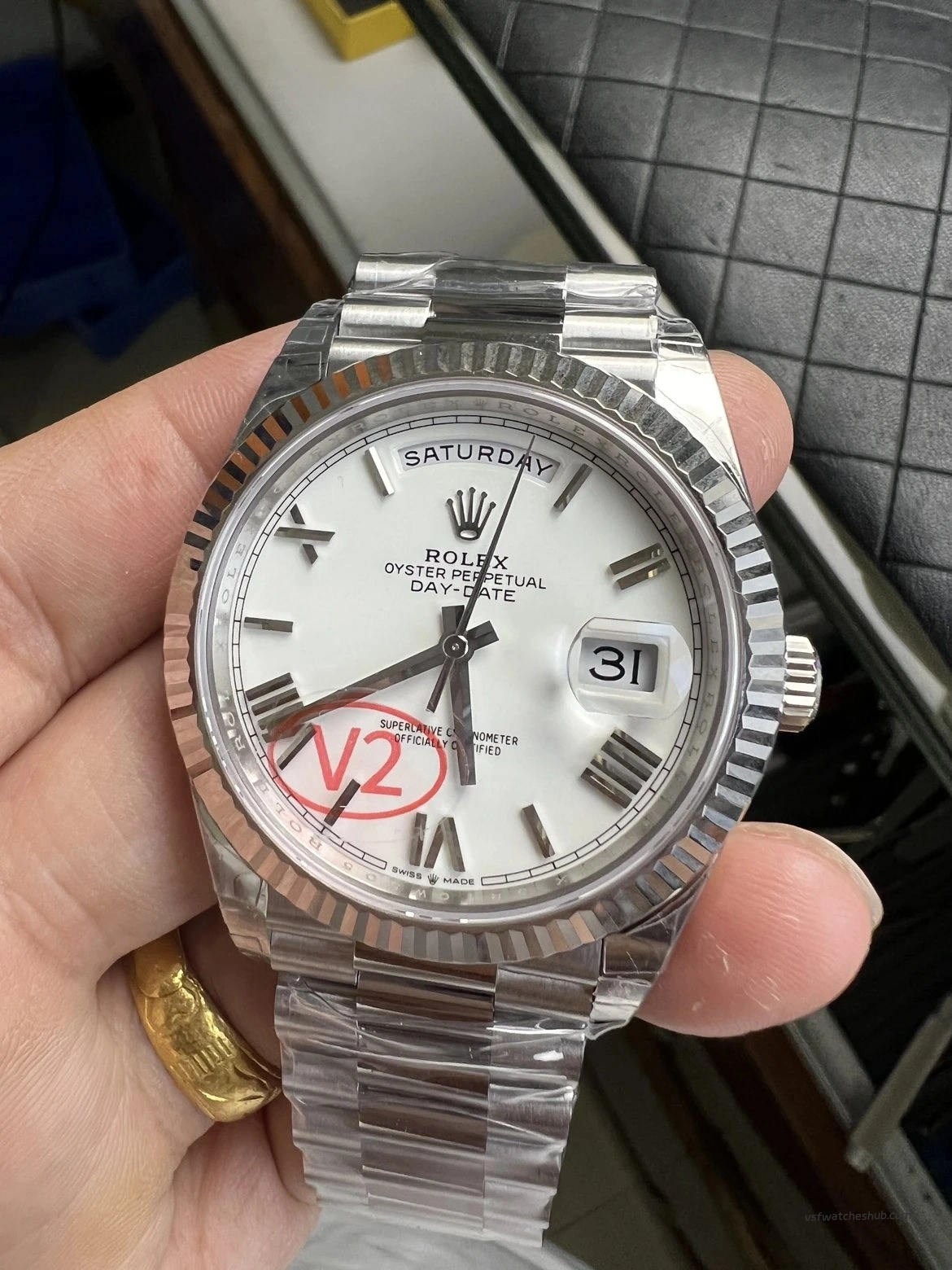 At vsfwatcheshub, we recently reviewed the upgraded VS Factory Rolex Day-Date 40 Ref. 228239 V2 weighted version, which represents one of the most refined modern Day-Date replicas currently available.