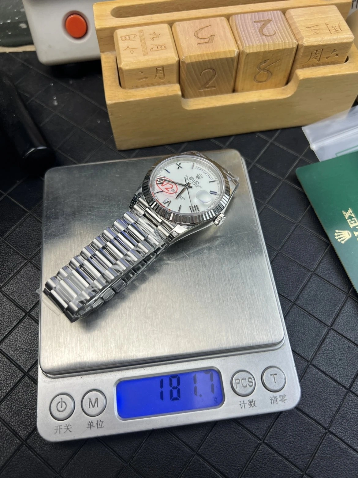 Combined with the ~182g total weight, the watch delivers a convincing Day-Date wearing experience.