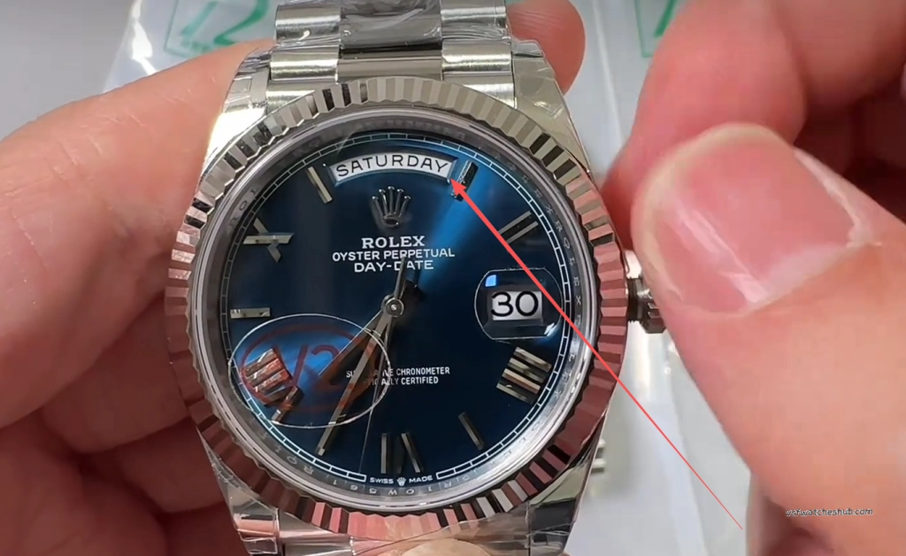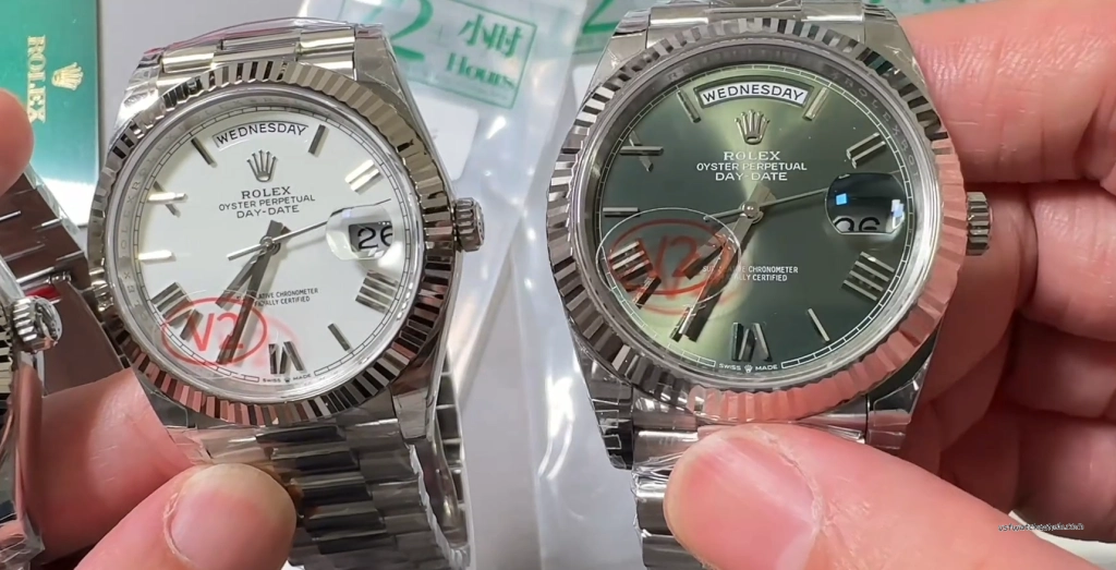 The genuine white-gold Day-Date does not appear bright silver white.