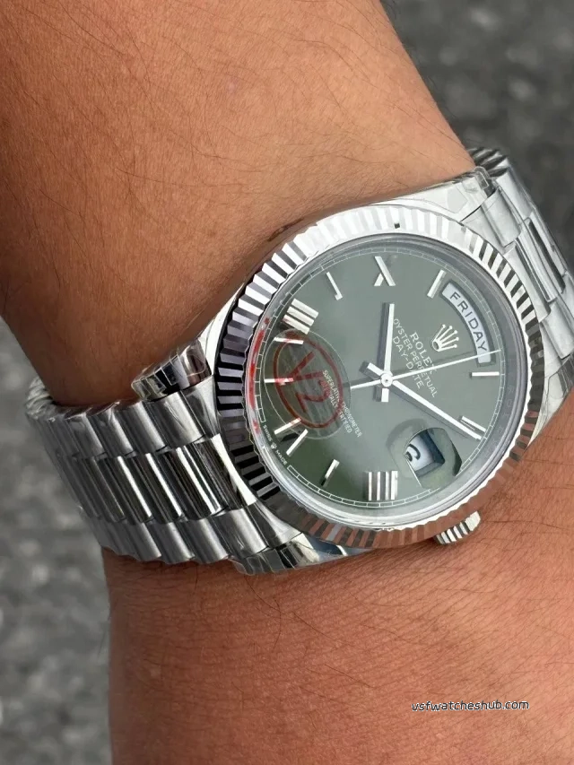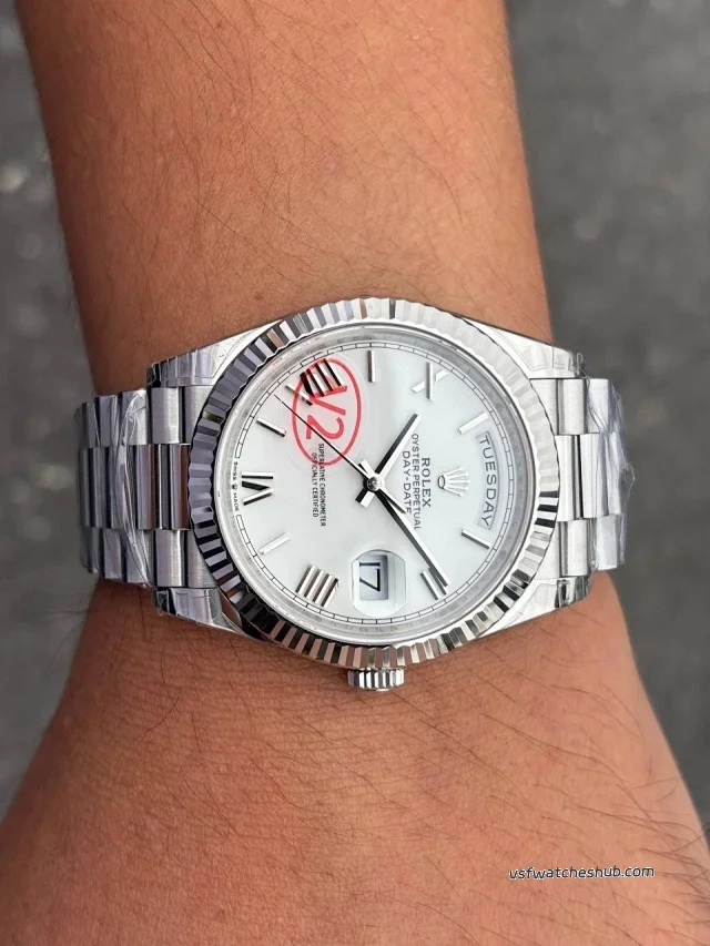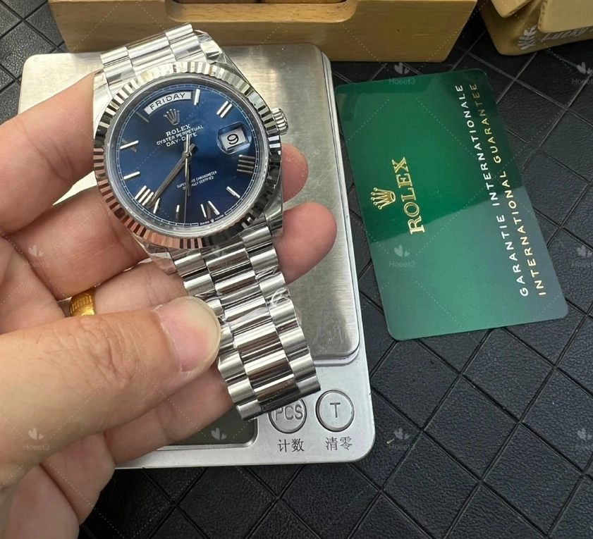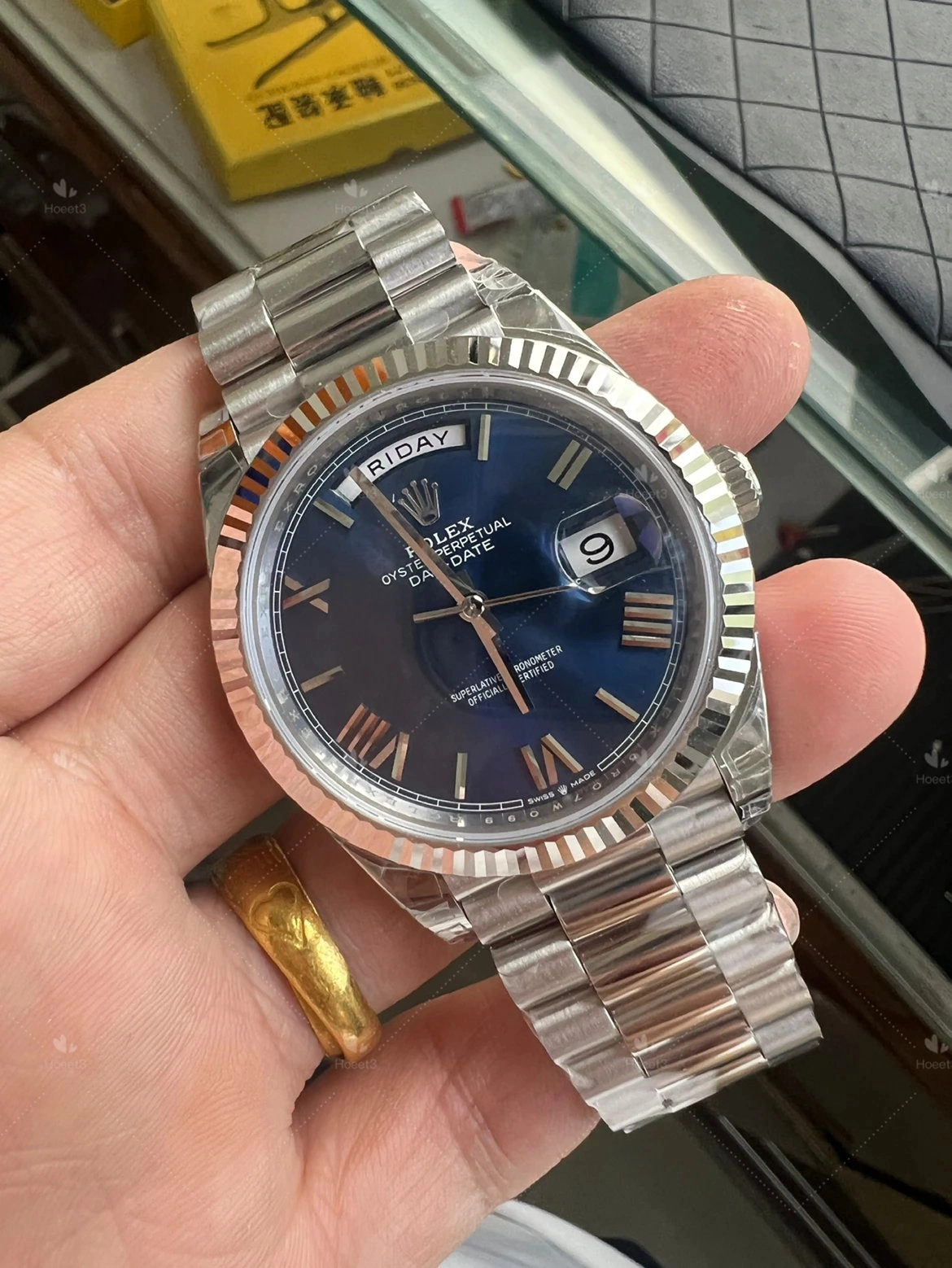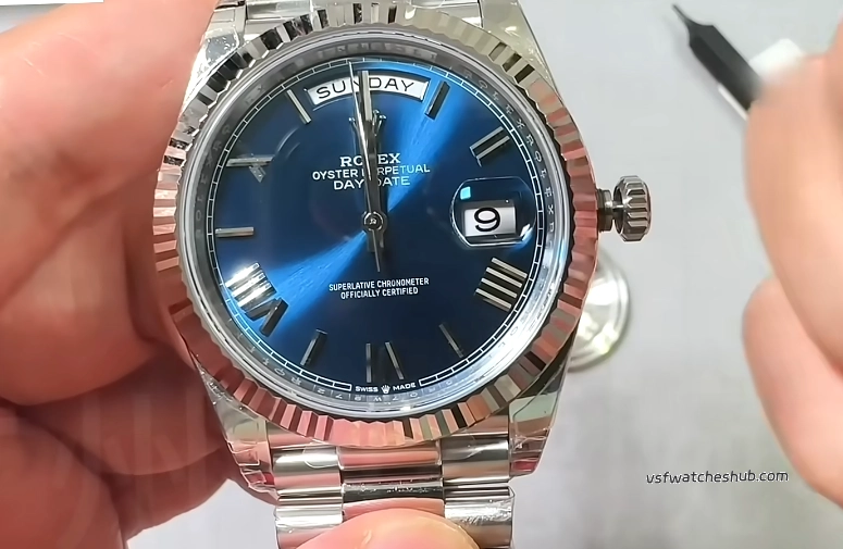 VS Factory's Day-Date 228239 blue roman dial is, detail for detail, the highest tier rep of this reference currently out. The blue sunburst dial, the fluted bezel finishing, how the day/date functions feel, and especially that exclusive Dandong 3255 — it all comes together really well. Weight is the only area where there's still a gap versus gen.