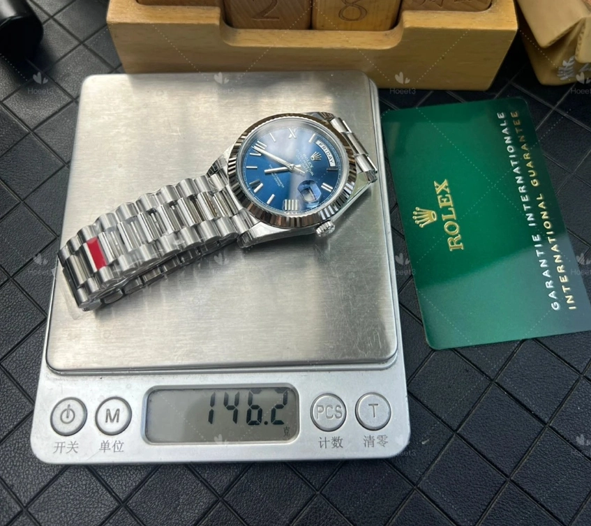 Alright so here's the honest part. This VS Factory Rolex 228239 comes in at roughly 145g. Gen is heavier. The gap is there because the bracelet doesn't have weighted links yet.