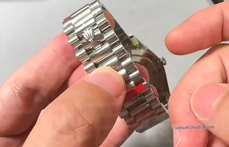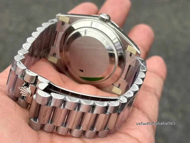 The date window has that beveled, 3D look to the font — size is correct and it sits centered the way it should. Same goes for the day display up top. Clean text, proper framing. Small detail but it makes or breaks the front-facing impression of a Day-Date and VS nailed it here.