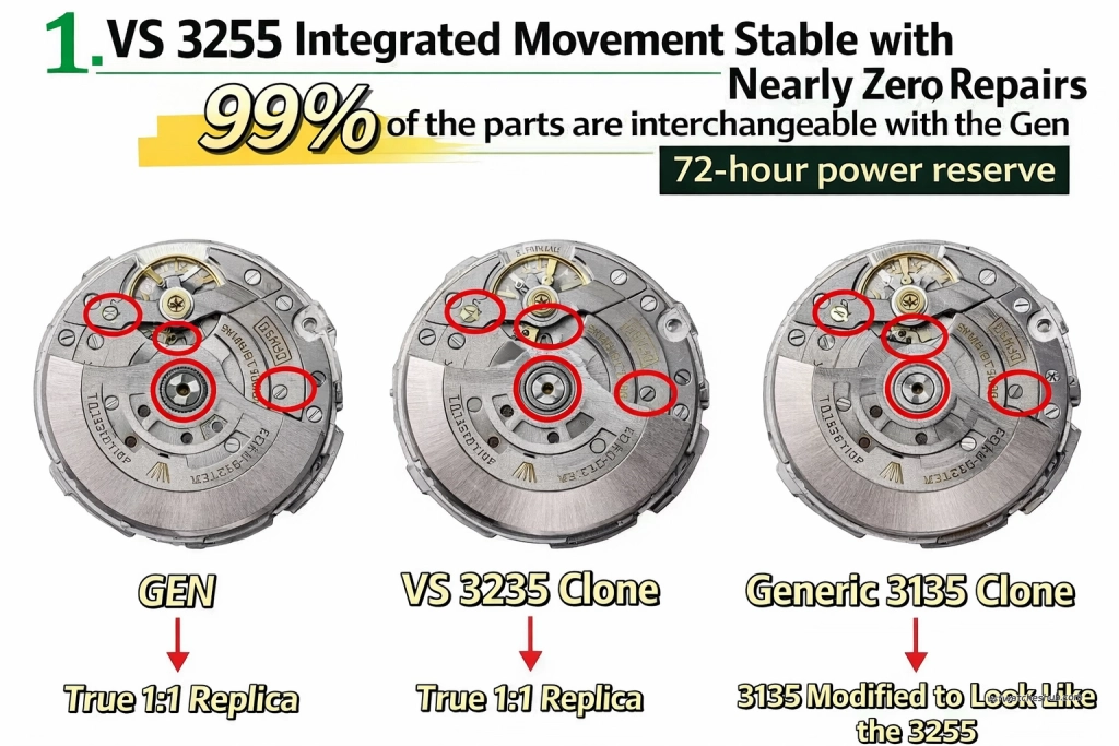 Under the balance wheel. The layout beneath the balance is structurally different from most other 3255 clones on the market. This is the dead giveaway for identifying VS's version specifically. If you've seen the side-by-side comparison photos going around the rep community, you know what I mean.