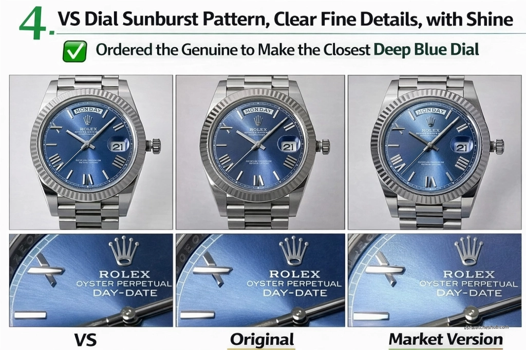 So VS Factory finally dropped their Day-Date 228239 in blue. First batch is blue only — more colorways supposedly coming later. I've had this one in hand for a bit now and wanted to walk through what's actually going on with it. The good stuff, the one weak spot, all of it.