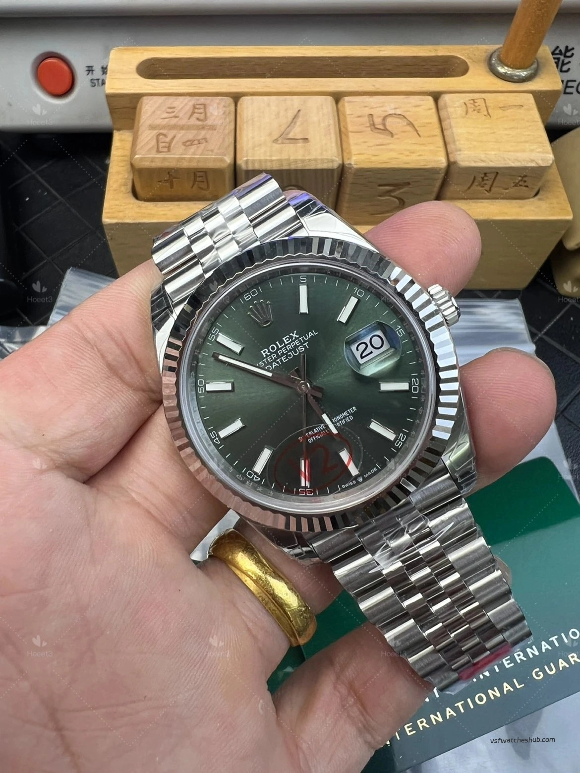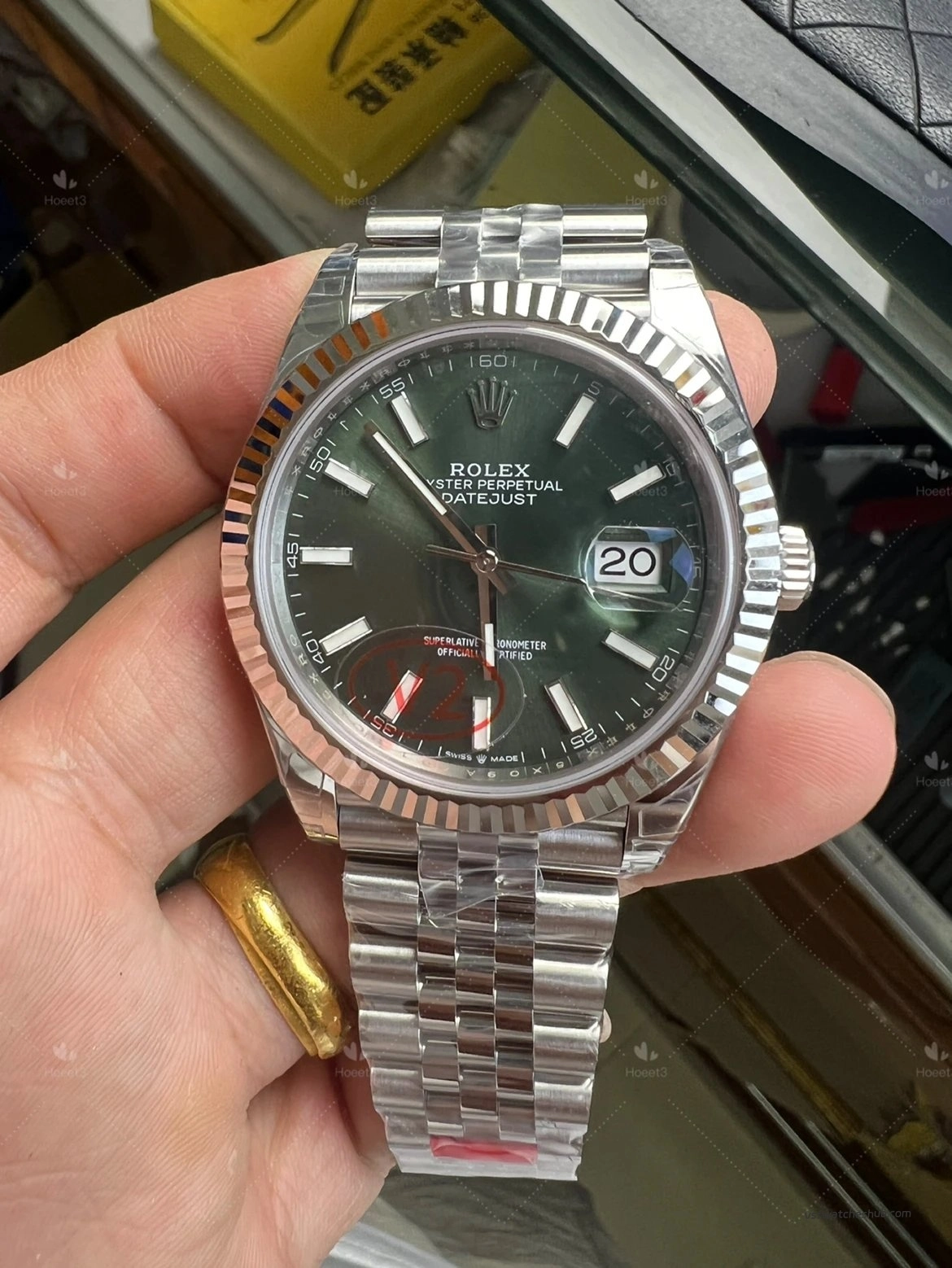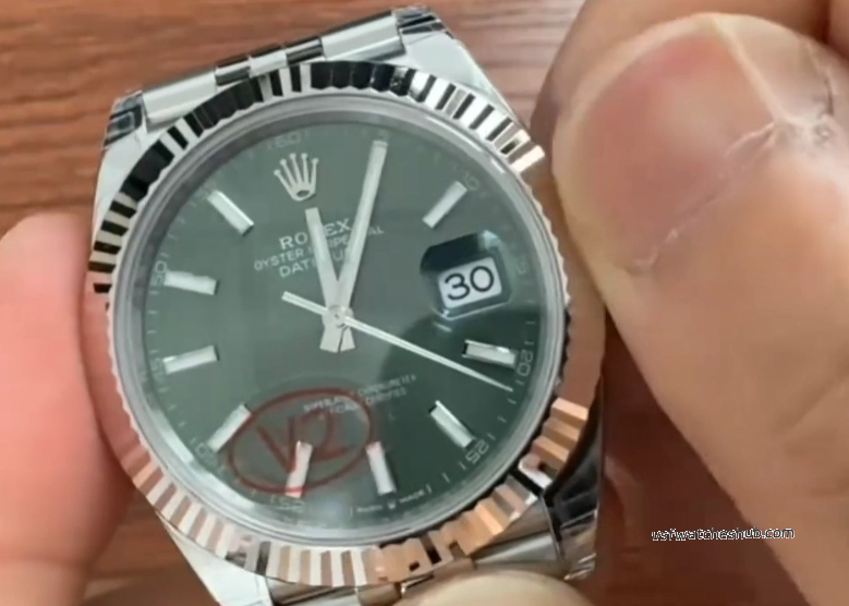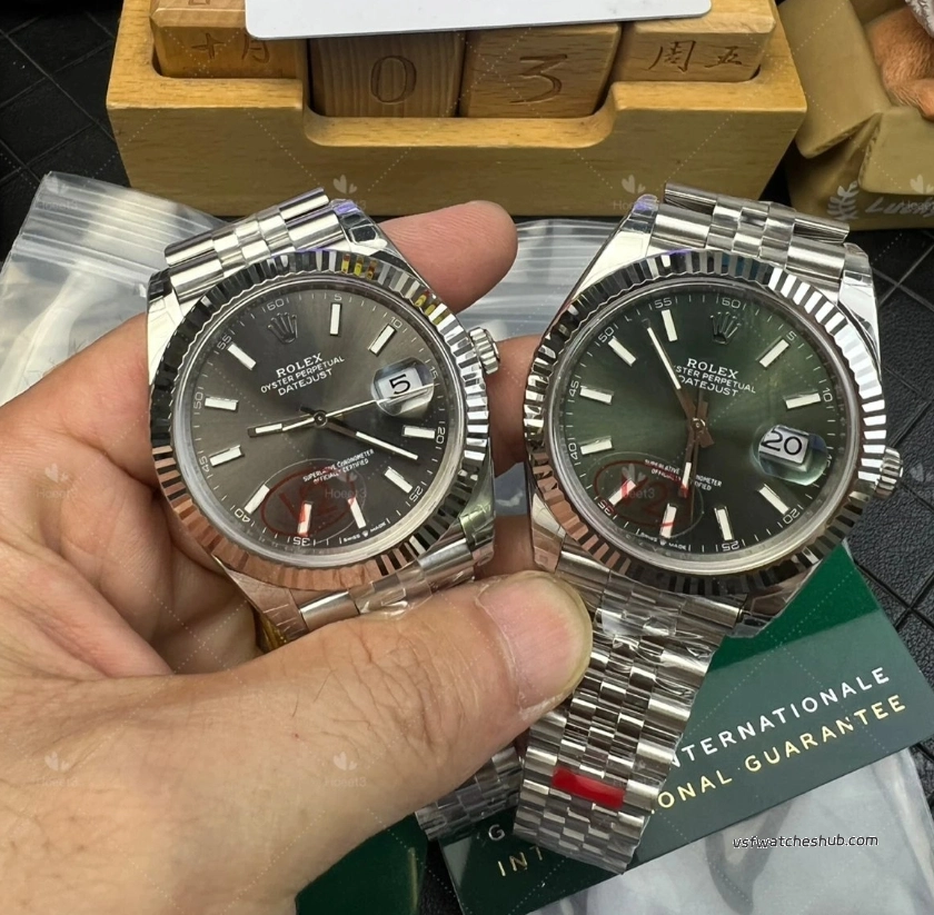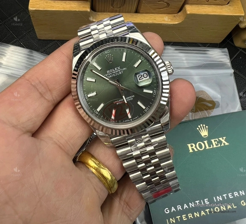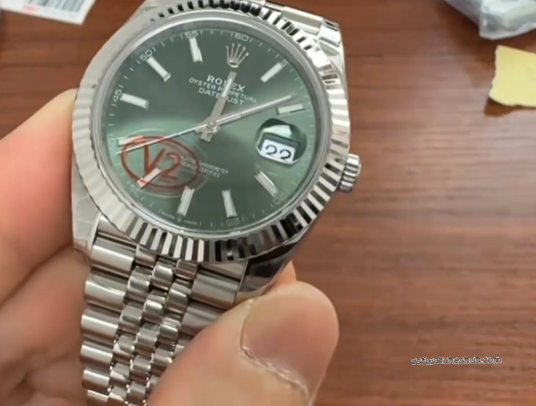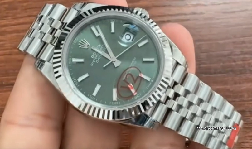 Some older green dials looked slightly darker, and the sunburst effect was not as lively. On this updated version, the dial appears richer and more vibrant, with a more natural green-gold reflection under changing light. That visual transition is closer to the genuine watch, and for a Datejust, dial color and light play are a huge part of the appeal.