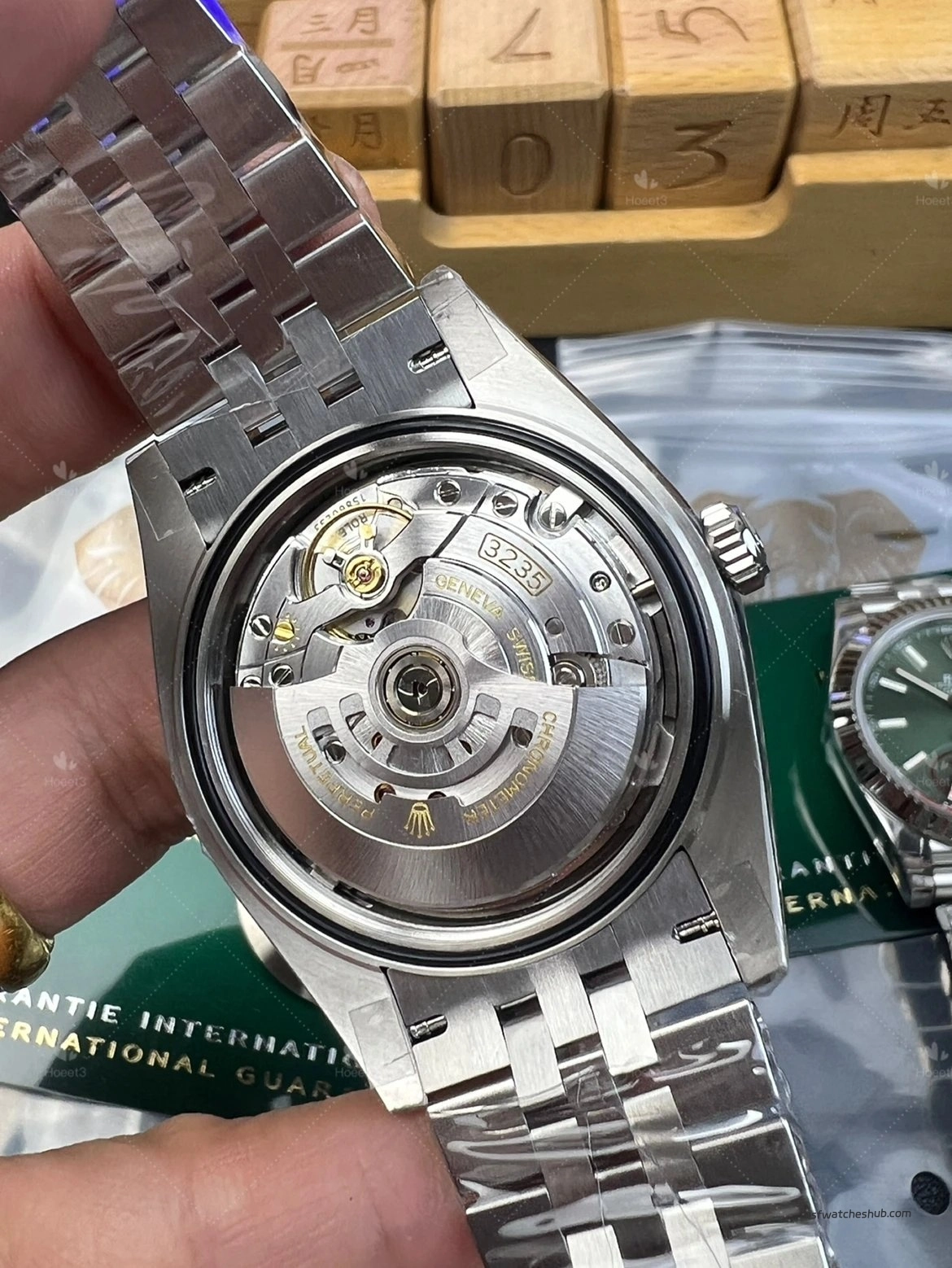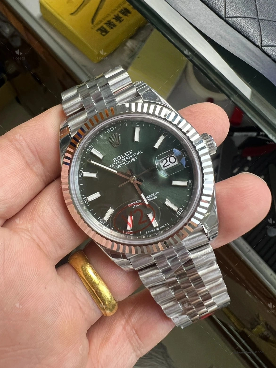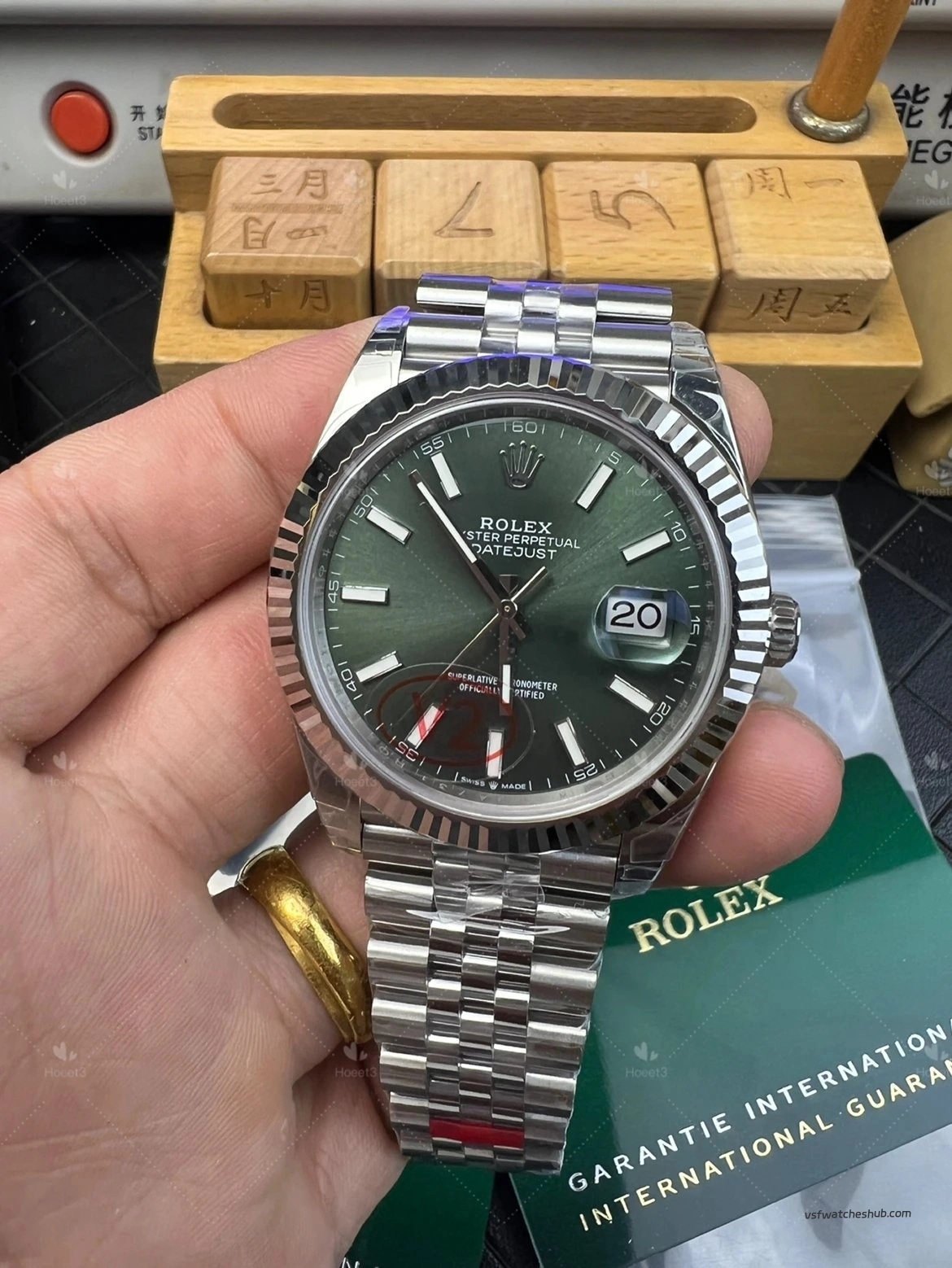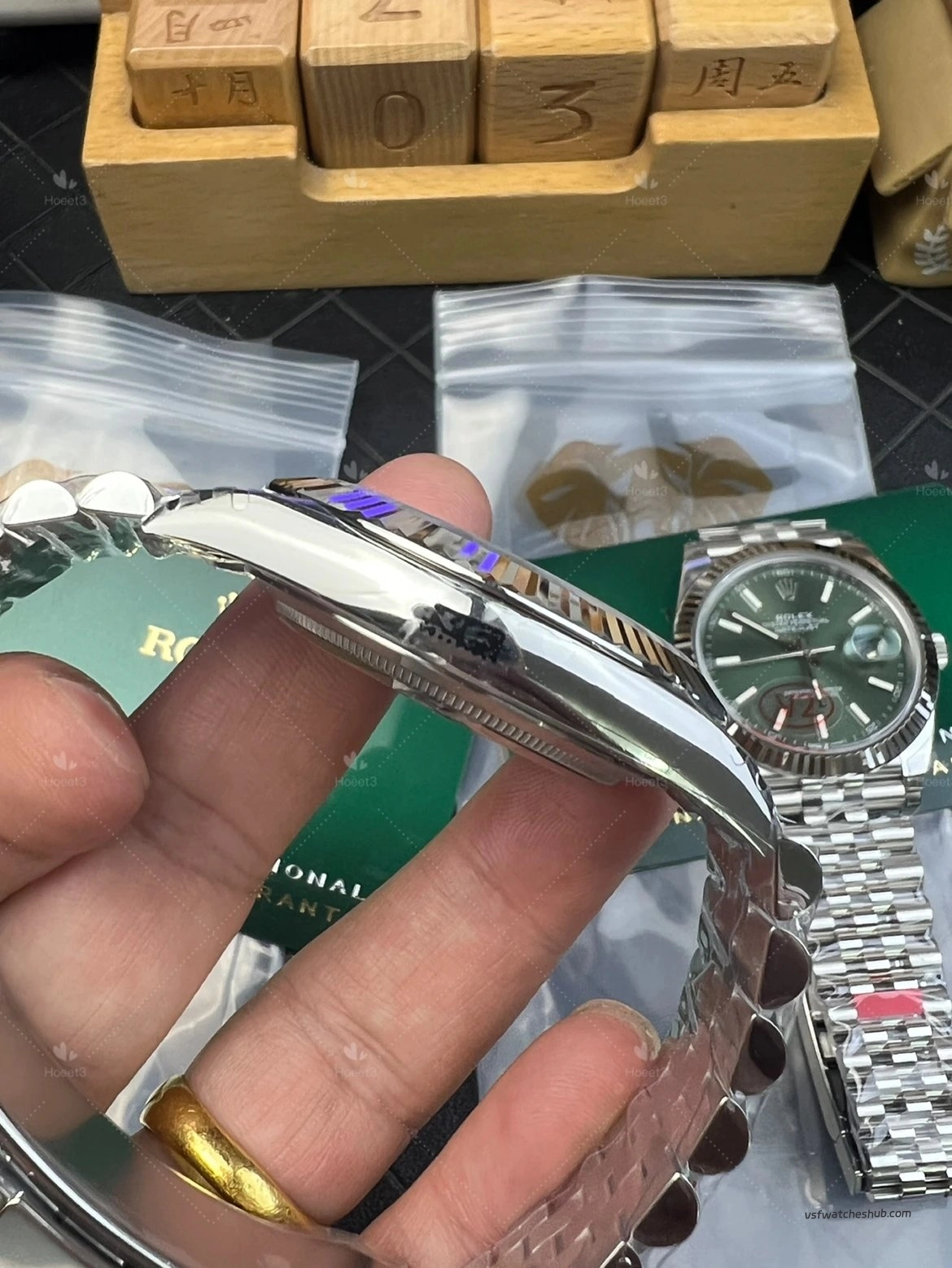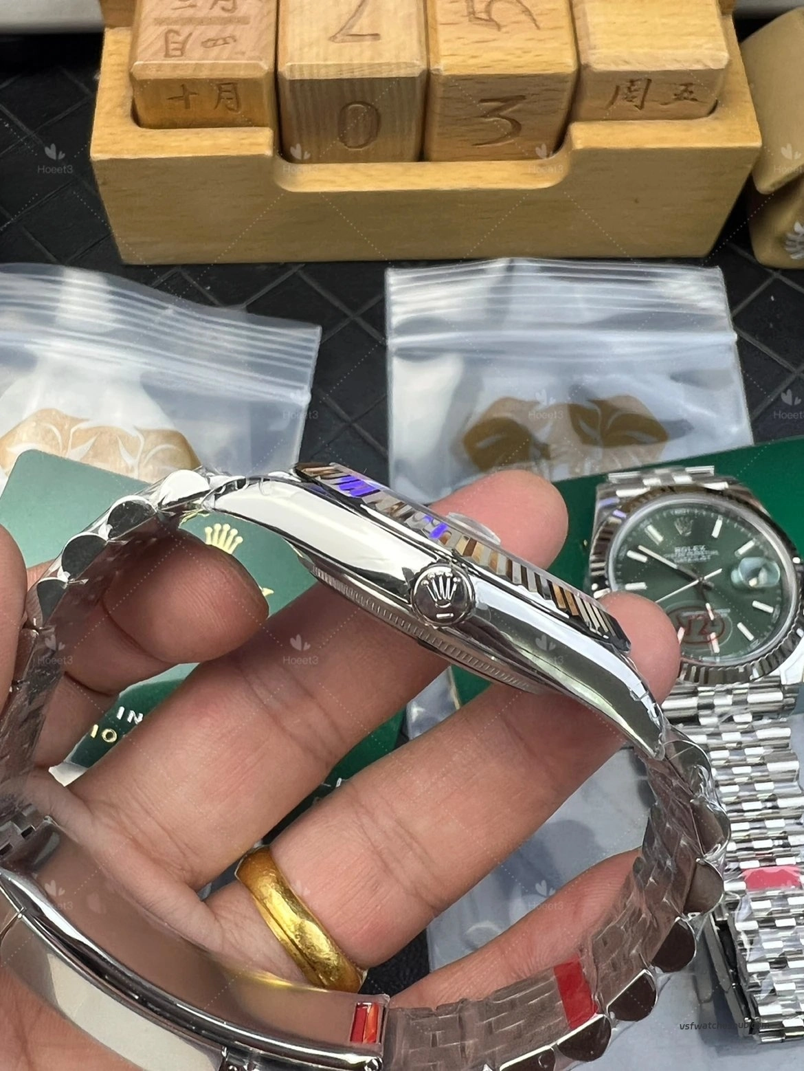 Some older green dials looked slightly darker, and the sunburst effect was not as lively. On this updated version, the dial appears richer and more vibrant, with a more natural green-gold reflection under changing light. That visual transition is closer to the genuine watch, and for a Datejust, dial color and light play are a huge part of the appeal.