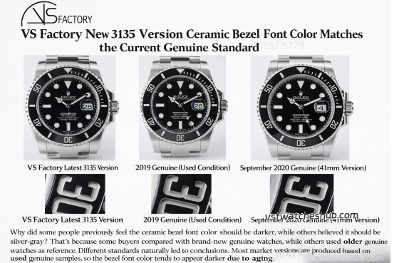 Ceramic bezel color: VS refers to the bright silver tone of the latest genuine bezel, while other versions tend to be silver-gray. The author also shared experience regarding the color changes of older bezel models and their maintenance.