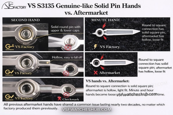 - VS hands (second, minute, hour) connect to the pinion with a clean right-angle joint like the genuine. Other versions use curved joints, especially the second hand difference is obvious, and many are not solid pinions. This is a key authentication point.