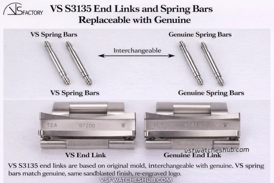 - VS spring bars are molded from genuine specifications and can be interchanged with genuine. Bracelet end links match genuine details, sandblasted and engraved with markings and logo.