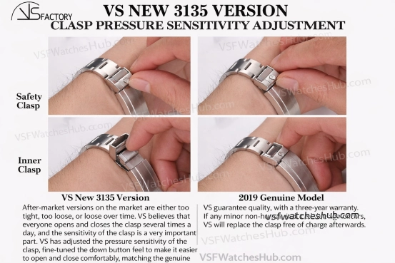 - VS clasp is adjusted to genuine force: easy and firm opening, slight damping when closing. Quality guaranteed. Within three years, if the small crown falls off (non-human damage), VS after-sales replaces a new clasp free.