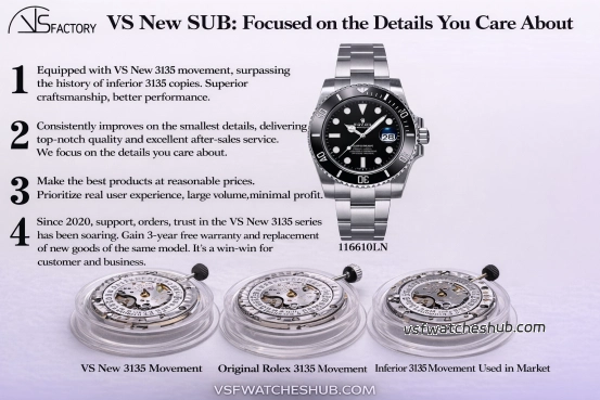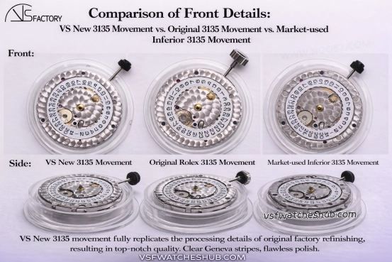 - VS new 3135 version uses the newly developed VS3135 integrated movement, completely new, not modified, rewriting the unstable history of replica 3135 movements.