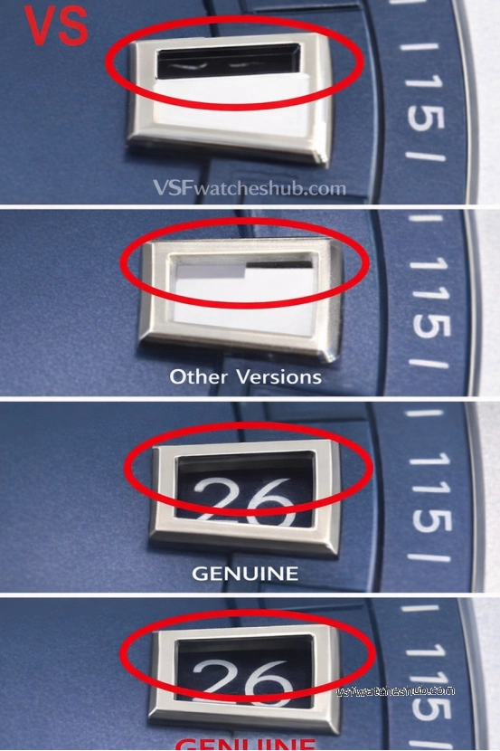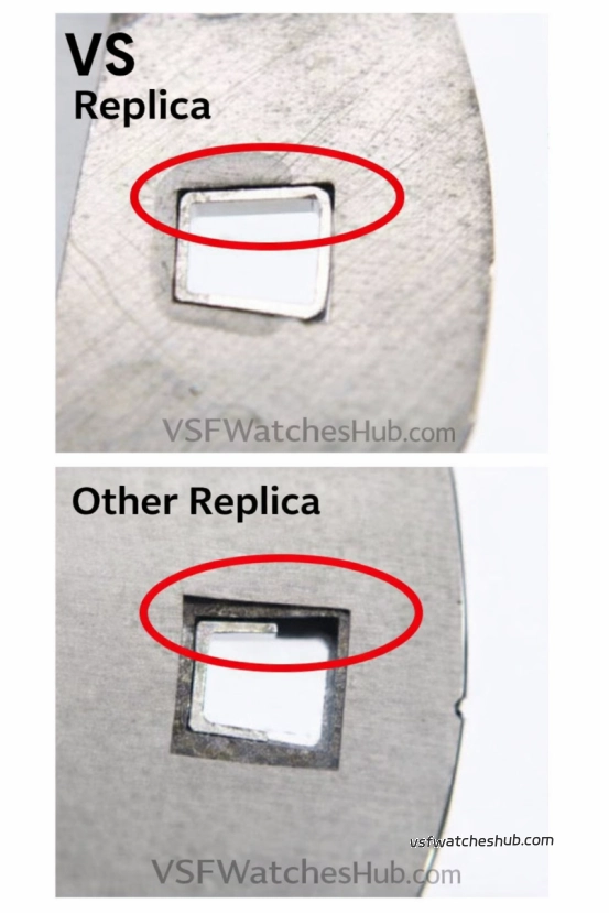 Date window: VS is the same as the genuine product, with no notch; other styles have obvious notches at the bottom, making them easy to identify.