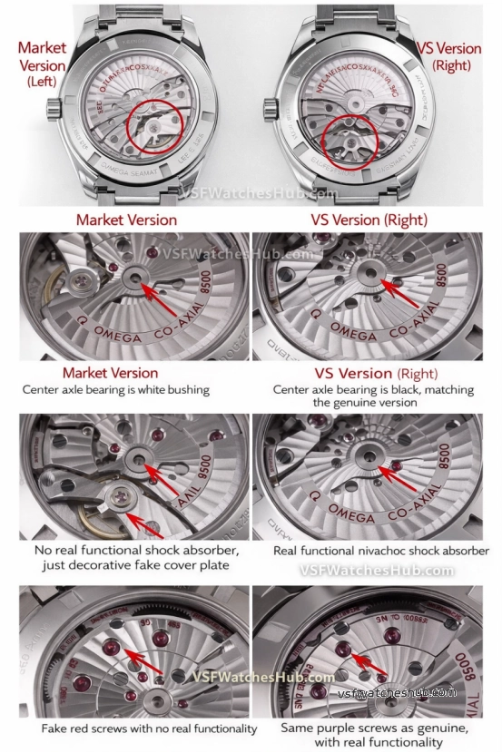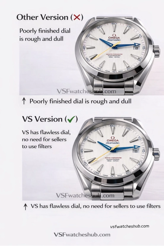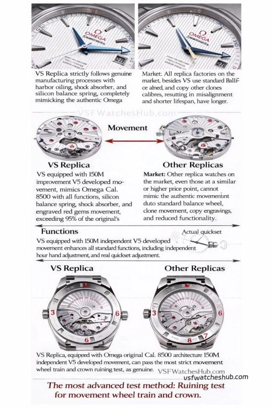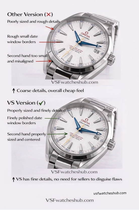 VS watches are crafted entirely using authentic techniques. Compared to other versions that still employ outdated methods (such as hydraulic pressing and piano lacquer), the VS Seamaster 150 boasts exquisite and high-end surface details, while other versions appear cheap. VS uses its self-developed integrated movement, with an appearance and functions 95% similar to the original movement; while most versions on the market still use the Miyota 8215 movement with a replica plate structure, which is prone to problems such as movement detachment, parts falling off, and inaccurate timekeeping.