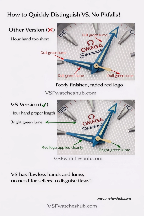 - Market hour hand lume slot short, tip short and flat; VS lume slot same length as genuine, hand color closer, larger lume fill.