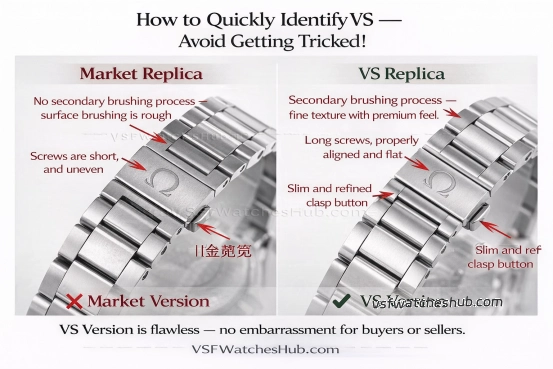 ✔ Through balance wheel position, dial texture, hand detail, date frame, brushing, one can quickly identify VS vs normal versions.